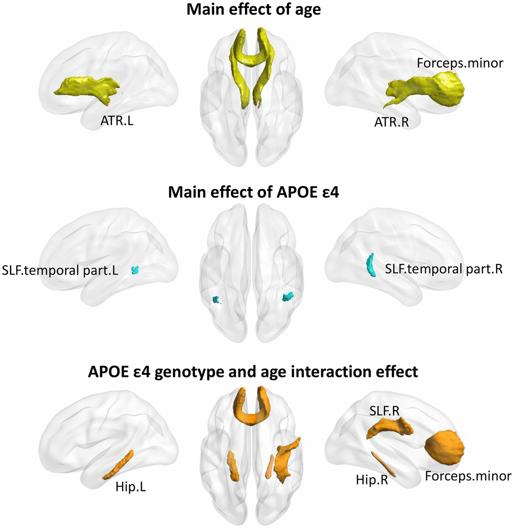 Based on the relatively small samples with available MRI data, there were 53 APOE ε4 carriers and 58 noncarriers included in white matter analysis (Supplementary Table 1). A main effect of age was found on the anterior fiber bundles, including bilateral anterior thalamic radiation (ATR), and forceps minor (FM). Significant main effect of APOEε4 genotype were found in posterior fiber bundles, including bilateral superior longitudinal fasciculus.temporal part (Figure 2). Among the FA values at each tract, significant APOEε4 genotype and age interaction effects were found in both anterior and posterior fibers, including bilateral cingulum. Hippocampus (Hip.L and Hip.R), FM, and right superior longitudinal fasciculus (SLF.R). Notably, the significant interaction results were not corrected for multiple comparisons and therefore should be regarded as exploratory in nature.