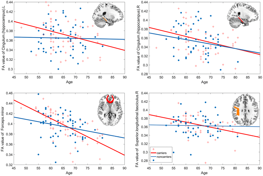 We further investigated how the age influences correlation between the above-identified white matter tracts and the cognitive performance in APOE ε4 carriers and noncarriers separately. Since there is no easy way to plot a two-way interaction with two continuous variables (i.e., white matter integrity and age), we first equally divided all carriers or noncarriers into four sub-groups in terms of the rank of age: low-age carriers (26 carriers, <65 years) and high-age carriers (27 carriers, ≥65 years), low-age noncarriers (30 noncarriers, <65 years) and high-age noncarriers (28 noncarriers, ≥65 years). And then calculate the partial correlation of white matter integrity and cognitive scores, accordingly. Gender and education were included as covariates.