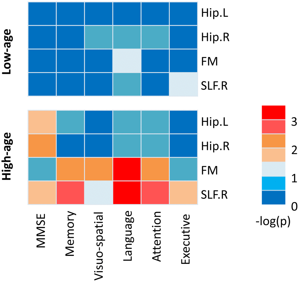 Correlations between each white matter integrity and cognitive score were performed in carriers in low-age and high-age group separately. As illustrated in Figure 4, within the high-age carriers, FA values of Hip.L and Hip.R were significantly correlated with MMSE (Hip.L: r=0.45, p=0.02; Hip.R: r=0.50, p=0.008), FA value of FM was significantly correlated with memory (r=0.55, p=0.005), visuo-spatial ability (r=0.56, p=0.004), attention (r=0.57, p=0.004), and language (r=0.67, p<0.001), FA value of SLF.R was significantly correlated with MMSE (r=0.48, p=0.01), memory (r=0.59, p=0.002), attention (r=0.58, p=0.003), language (r=0.63, p<0.001), and executive function (r=0.46, p=0.025). However, there is no significant relationship between white matter integrity and cognitive performance in the low-age carriers. SLF.R-language and FM-language were survived false-discovery rate (FDR) correction for multiple comparisons at a level q<0.05. Additionally, we found that significant FM-attention and SLF.R-attention correlations in low-age noncarriers and FM-language and FM-Visuo-spatial ability correlations in the high-age noncarriers (Supplementary Table 2).