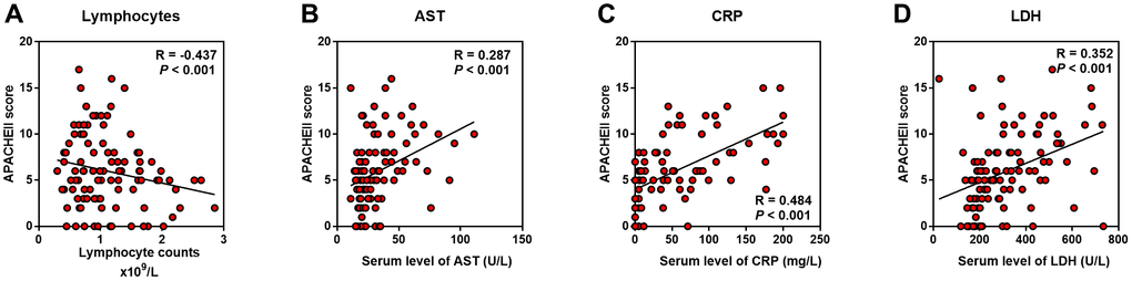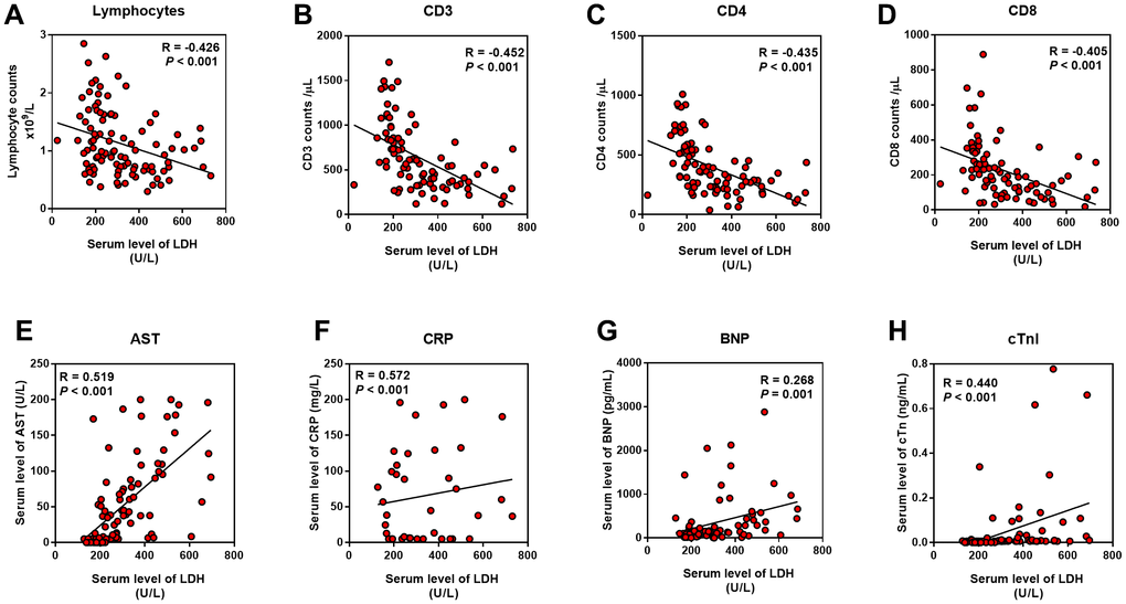 As the serum LDH level showed the highest Correlation Coefficient in the correlation with APACHE II, SOFA, CT score, and P/F ratio, we evaluated the relationship between LDH and lymphocytes (including subsets), serum CRP, AST, BNP, and cTnI level. We found that LDH was positively correlated with CRP, AST, BNP, and cTnI, while negatively correlated with lymphocytes and its subsets, including CD3+, CD4+ and CD8+ T cells (P < 0.01) (Figure 4).