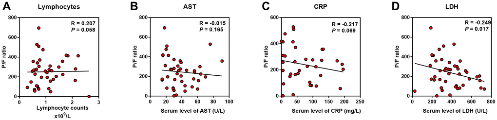 Among the risk factors we investigated in this study, we surprisingly discovered that LDH had the most positive relationship between both P/F ratio and CT score. In addition, it was also most positively relevant to APACHE II and SOFA scores, which reflected a strong correlation between LDH with lung damage as well as disease severity. LDH is a major player in glucose metabolism which is present in tissues throughout the body and catalyzes pyruvate to lactate. It is released from cells upon damage of their cytoplasmic membrane [11]. Previous studies also had noted the importance of LDH as an indicator of lung diseases. In a study on Epstein-Barr virus (EBV), researchers found that EBV infected B cells had more LDH transcripts than the uninfected B cells [12]. In addition, the serum levels of LDH increased in pneumocystis pneumonia (PcP) patients, probably was due to lung injury [13, 14]. Among patients who were infected during the 2009 influenza A (H1N1) pandemic, 77.8% whose laboratory test showed LDH > 225U/L had lung involvement, without differences between adult and children [15], which indicated that LDH elevation was associated with various pathogens including viruses, and was relevant to lung injury. Furthermore, there was a case reported in 2017 that a patient with human Zika virus infection had markedly elevated LDH, which was associated with 70% mortality in further a Zika-infected animal study. They considered LDH as an indicator of multiorgan injury, not only affecting liver or cardiac function [16].