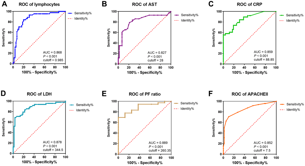 To assess the diagnostic value of these selected parameters, receiver operating characteristic (ROC) curve and area under ROC curve (AUC) were calculated using R package “pROC”. As indicated in Figure 3, the area under curve (AUC = 0.878) implied a perfect accuracy of the serum LDH level more than 344.5 U/L in COVID-19 patients as a predictive factor for identification of severe condition, with the high specificity (96.9%) and sensitivity (68.8%) (Figure 3D). The serum AST level over 28 U/L and CRP over 88.85 mg/L showed relative moderate accuracy with AUC = 0.827 and AUC = 0.859 (Figure 3B, 3C). As a protective factor, the lymphocytes less than 0.985 x 109 /L showed a good accuracy for identification of severe patients with AUC = 0.868, the maximum specificity (84.1%) and sensitivity (80.0%) (Figure 3A). Furthermore, AUC of P/F ratio was 0.889, CT score was 0.881, and APACHE II was 0.852. The other indicators were relatively poor accuracy factors in ROC curve analysis (Figure 3, Table 5).
