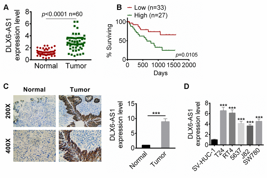 Figure 1. DLX6-AS1 was up-regulated in BC tissues and cell lines. (A) The DLX6-AS1 expression in 60 cases of BC tissues and adjacent normal tissues were determined by qRT-PCR. (B) The relationship of 5 year survival rate of the BC patients with high (n=27) or low (n=33) DLX6-AS1 expression were analyzed by Kaplan-Meier’s method and the log-rank test. (C) The expression of DLX6-AS1 in BC tissues and normal tissues was determined by ISH assay. (D) The mRNA expression level of DLX6-AS1 in a human bladder epithelium immortalized cell line (SV-HUC-1) and five BC cell lines (T24, RT4, 5637, J82, and SW780) was determined by qRT-PCR. The DLX6-AS1 was highly expressed in BC cells. Data were expressed as the mean ± SD. ***P < 0.001 vs SV-HUC-1.