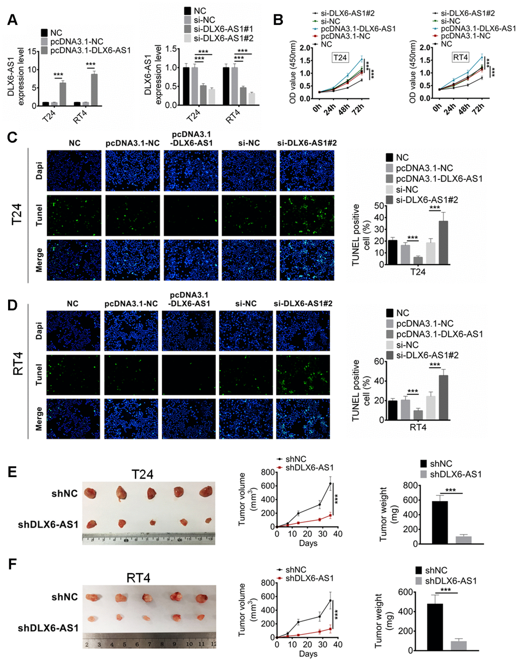 Figure 2. DLX6-AS1 promotes proliferation and inhibits apoptosis of BC cells in vitro and in vivo. (A) The expression of DLX6-AS1 was over-expressed by pcDNA3.1-DLX6-AS1 or down-regulated by sh-DLX6-AS1 in T24 and RT4 cells, and the transfection efficiency was identified by qRT-PCR. (B) Cell proliferation of T24 and RT4 cells with pcDNA3.1-DLX6-AS1 or sh-DLX6-AS1 transfection was determined by CCK-8 assay. (C, D) The apoptosis of T24 and RT4 cells with pcDNA3.1-DLX6-AS1 or sh-DLX6-AS1 transfection was determined by TUNEL staining assay. (E, F) A subcutaneous BC tumor model (n=6/group) was established by using T24 and RT4 cells to evaluate the anti-tumor effect of shDLX6-AS1, and tumor volume and weight were calculated. Data were expressed as the mean ± SD. ***P < 0.001.