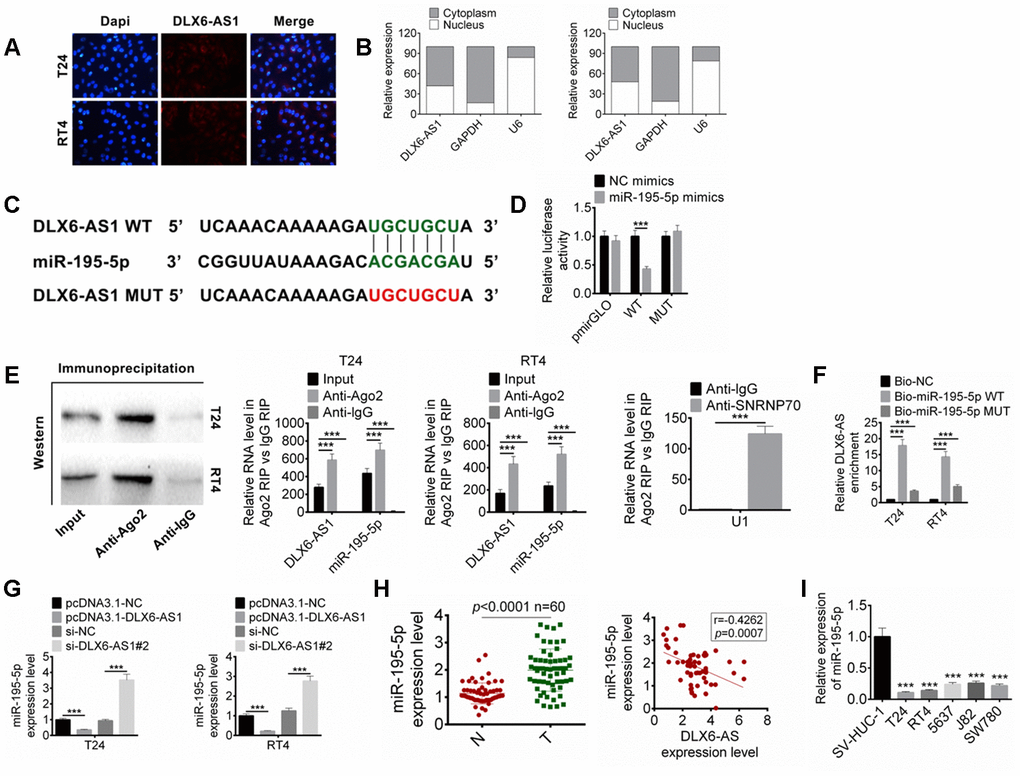 Figure 4. DLX6-AS1 targets miR-195-5p. (A) The expression of DLX6-AS1 in BC cells was determined by FISH assay. (B) The specific location of DLX6-AS1 was identified in BC cells through performing subcellular fractionation assay. (C) The binding sites of DLX6-AS1 and miR-195-5p was predicted. (D) The binding of miR-195-5p and DLX6-AS1 was verified by dual-luciferase reporter assay. (E) The binding of miR-195-5p and DLX6-AS1 was validated by RIP assay. (F) The binding of miR-195-5p and DLX6-AS1 was validated by RNA pull down assay. (G) The expression of miR-195-5p in BC cells with DLX6-AS1 overexpression or knockdown was determined by qRT-PCR. (H) The expression of miR-195-5p in BC tissues and the relationship between DLX6-AS1 and miR-195-5p expression were determined. (I) The miR-195-5p expressions in BC cell lines (T24, RT4, 5637, J82, and SW780) and SV-HUC-1 cells by qRT-PCR. Data were expressed as the mean ± SD, n = 3. ***P < 0.001.