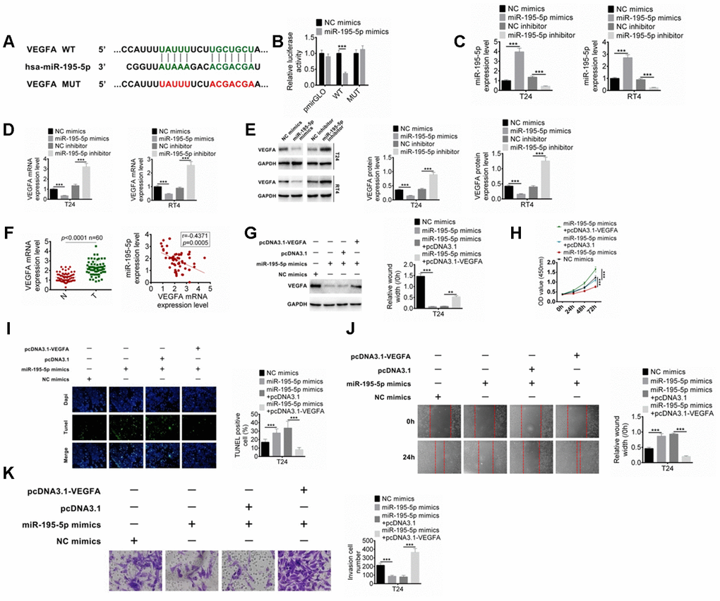 Figure 5. MiR-195-5p combines with VEGFA. (A) The target of miR-195-5p was predicted by Targetscan. (B) The binding of miR-195-5p and VEGFA was verified by dual-luciferase reporter assay. (C) BC cells were transfected with miR-195-5p mimics or inhibitors, and the transfection efficiency of miR-195-5p was determined by qRT-PCR. (D) The mRNA expression of VEGFA in T24 and RT4 cells with miR-195-5p mimics or miR-195-5p inhibitors was examined by qRT-PCR. (E) The protein expression of VEGFA in T24 and RT4 cells were identified by western blot. (F) The VEGFA expression in BC tissues and the relationship of VEGFA and miR-195-5p expression were explored. (G) The VEGFA protein expression in T24 cells with miR-195-5p mimics transfection, or miR-195-5p mimics+ pcDNA3.1 co-transfection was determined by western blot. (H–K) Cell proliferation, apoptosis, migration, and invasion of T24 cells were examined by CCK8, Tunel, scratched wound healing and transwell assay, respectively. Data were expressed as the mean ± SD, n = 3. **P < 0.01, ***P < 0.001.