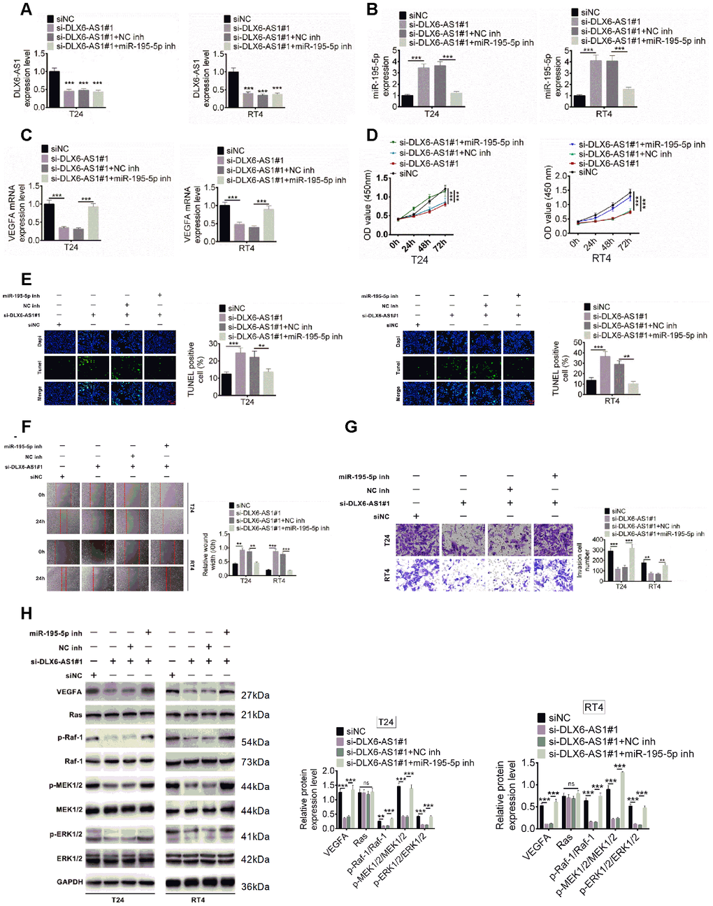 Figure 6. Effect of DLX6-AS1 and miR-195-5p on proliferation, migration, and invasion of BC cells and phosphorylation of VEGFA, Ras, MEK1/2, ERK1/2. (A–C) BC cells were transfected with siNC, siNC + si-DLX6-AS1, si-DLX6-AS1 + NC inhibitor, or si-DLX6-AS1 + miR-195-5p inhibitor. DLX6-AS1 expression (A), miR-miR-195-5p expression (B), and VEGFA mRNA expression (C) were examined by qRT-PCR assay. (D) Cell proliferation of BC cells was identified by CCK8 kit. (E) Cell apoptosis was examined by TUNEL assay. (F) Cell migration was detected by wound healing assay. (G) Cell migration was identified by transwell assay. (H) The effect of sh-DLX6-AS1 and miR-195-5p inhibitor on protein expression and phosphorylation levels of VEGFA and Ras/ERK signaling molecules was evaluated by western blot. Data were expressed as the mean ± SD, n = 3. *P < 0.05, **P < 0.01, ***P < 0.001.