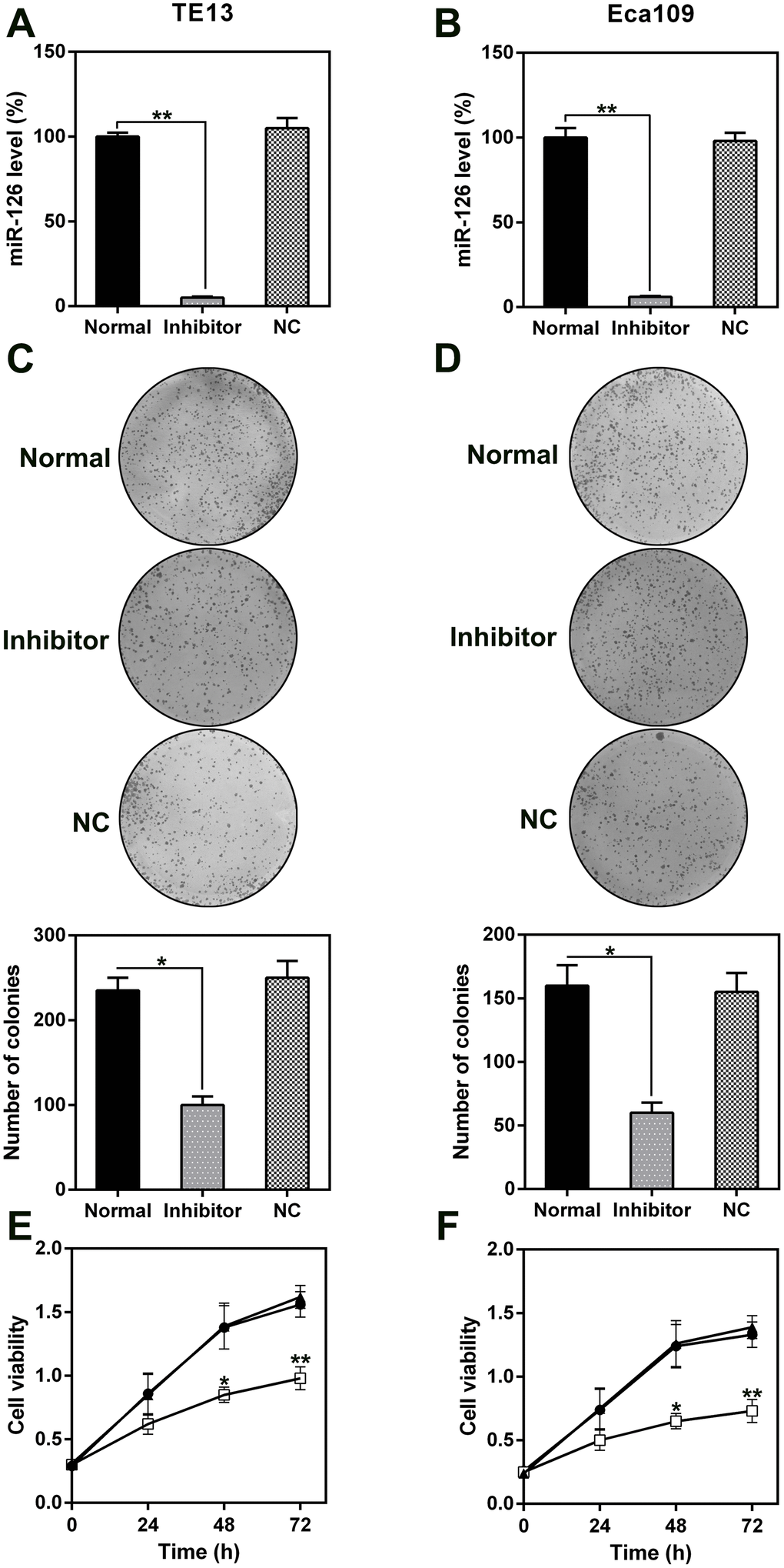The role of miR-126 in ESCC cell proliferation and viability was analyzed by transfecting TE13 and Eca109 cells with a miR-126 inhibitor. This resulted in a notable reduction in the miR-126 levels in the cells (Figure 3A, 3B). Likewise, the results of a soft agar CFA showed that aberrant miR-126 expression caused an obvious reduction in the colony numbers formed by TE13 and Eca109 cells, whereas the NC-inhibitor had no effect (Figure 3C, 3D). The results of the MTT assay indicated that TE13 and Eca109 cell proliferation was noticeably inhibited at 1, 2, and 3 d after transfection with the miR-126 inhibitor (Figure 3E, 3F).