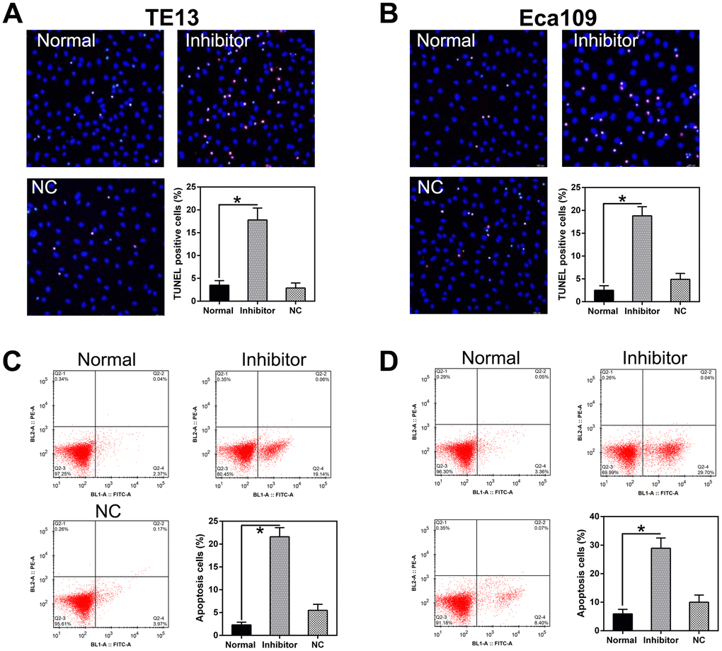 miR-126 silencing attenuated TE13 and Eca109 cell proliferation and viability; we speculated that this may be due to the stimulation of apoptosis or autophagy in the cells. TUNEL staining (Figure 4A, 4B) and flow cytometry (Figure 4C, 4D) did indeed confirm that a higher level of apoptosis occurred in PC cells treated with the miR-126 inhibitor than in normal cells or cells transfected with the NC-inhibitor.