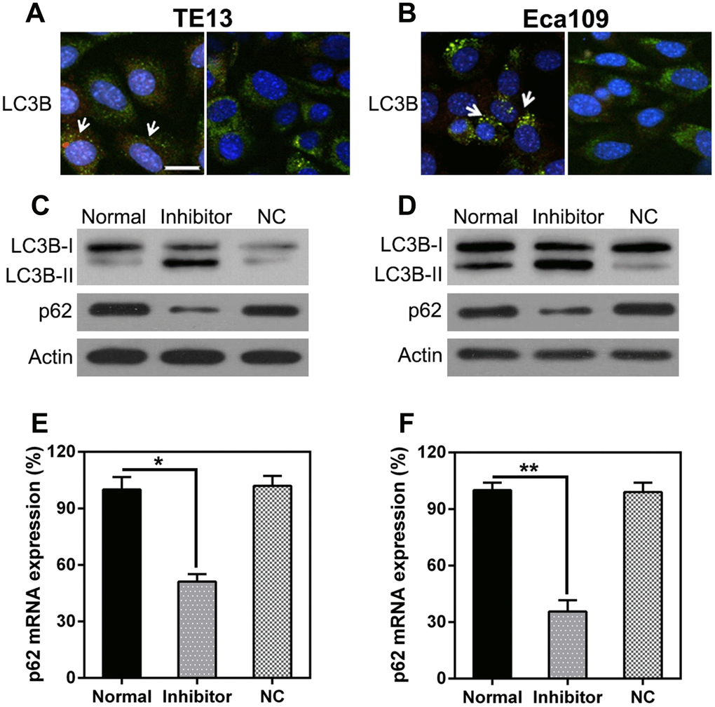 The effect of miR-126 inhibition on autophagy in ESCC cells was also explored. IFA was used to detect LC3B protein expression after miR-126 silencing; the results show LC3B (green) accumulation in the cells treated with the miR-126 inhibitor (Figure 5A, 5B). Autophagy was enhanced in the two ESCC cell lines following miR-126 inhibition, as indicated by the augmented LC3B biosynthesis and processing and p62 degradation (two main indicators of autophagy) (Figure 5C, 5D). Furthermore, qPCR was used to assess p62 transcription; the results revealed a positive correlation with miR-126 concentrations (Figure 5E, 5F). These results demonstrate that miR-126 may inhibit ESCC cell autophagy, which could help promote cell proliferation.