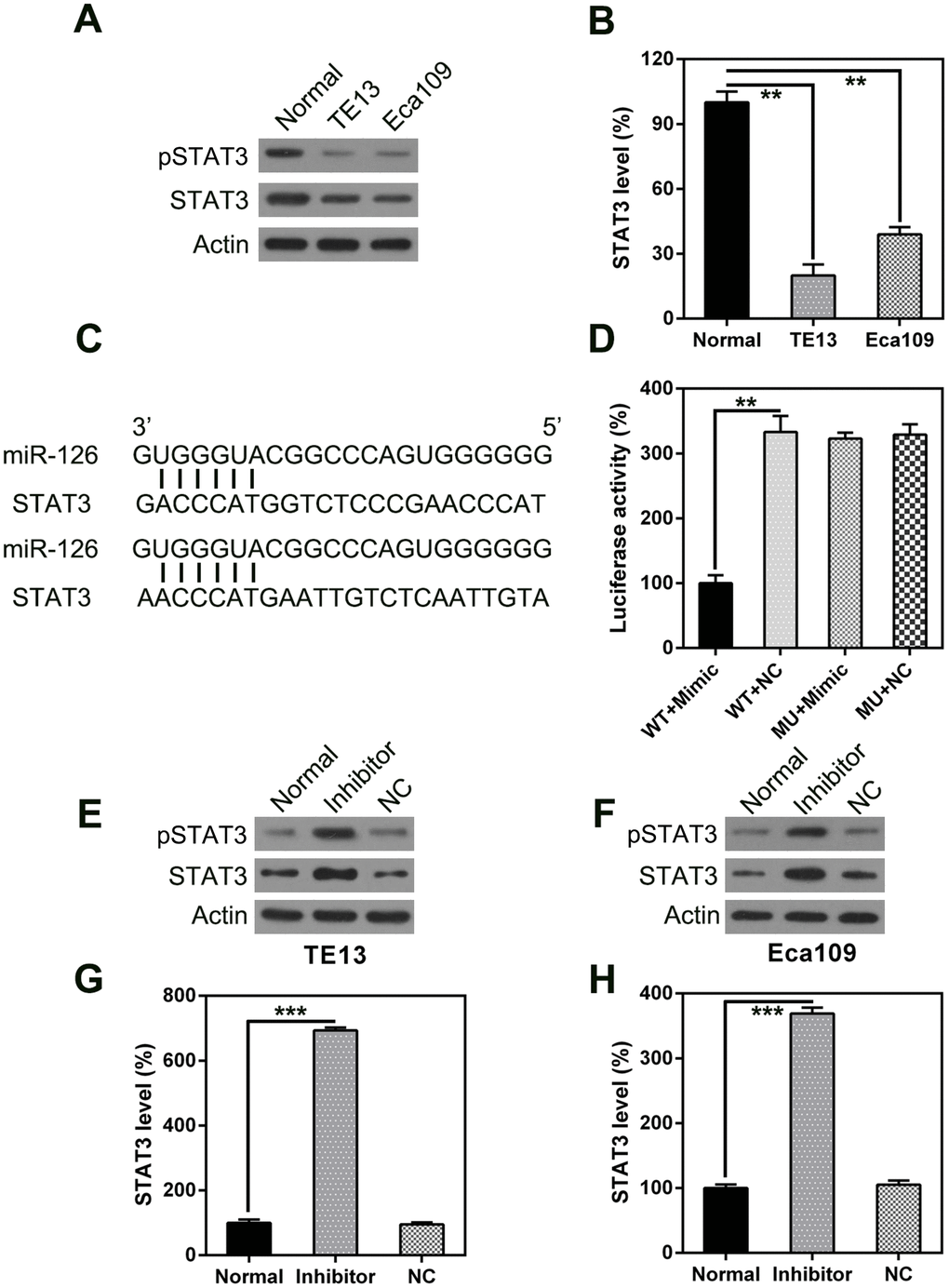 The effect of miR-126 inhibition on STAT3 expression in TE13 and Eca109 cells was determined using qPCR and WB. The expression levels of STAT3 mRNA and protein were found to be upregulated following transfection of the miR-126 inhibitor (Figure 6E–6H). These findings demonstrate that STAT3 expression is increased after miR-126 silencing and suggest that miR-126 may target the STAT3 3’-UTR.