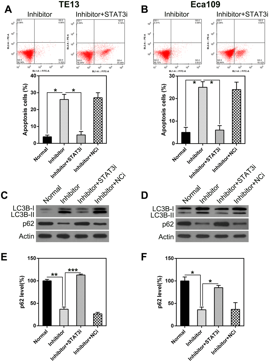 To determine whether STAT3 knock-down inhibits the effect of miR-126 on ESCC cell viability, including apoptosis and autophagy, we silenced STAT3 transcription in TE13 and Eca109 cells following treatment with the miR-126 inhibitor. qPCR and WB were used to assess the changes in STAT3 expression (Figure 7A–7D). An MTT assay was also used to evaluate the effect on cell proliferation (Figure 7E, 7F). To assess the role of STAT3 in ESCC cell apoptosis, we performed a TUNEL assay on TE13 and Eca109 cells that were treated with the miR-126 inhibitor. FC results showed that aberrant STAT3 expression caused an obvious reduction in the number of apoptotic ESCC cells (Figure 8A, 8B).