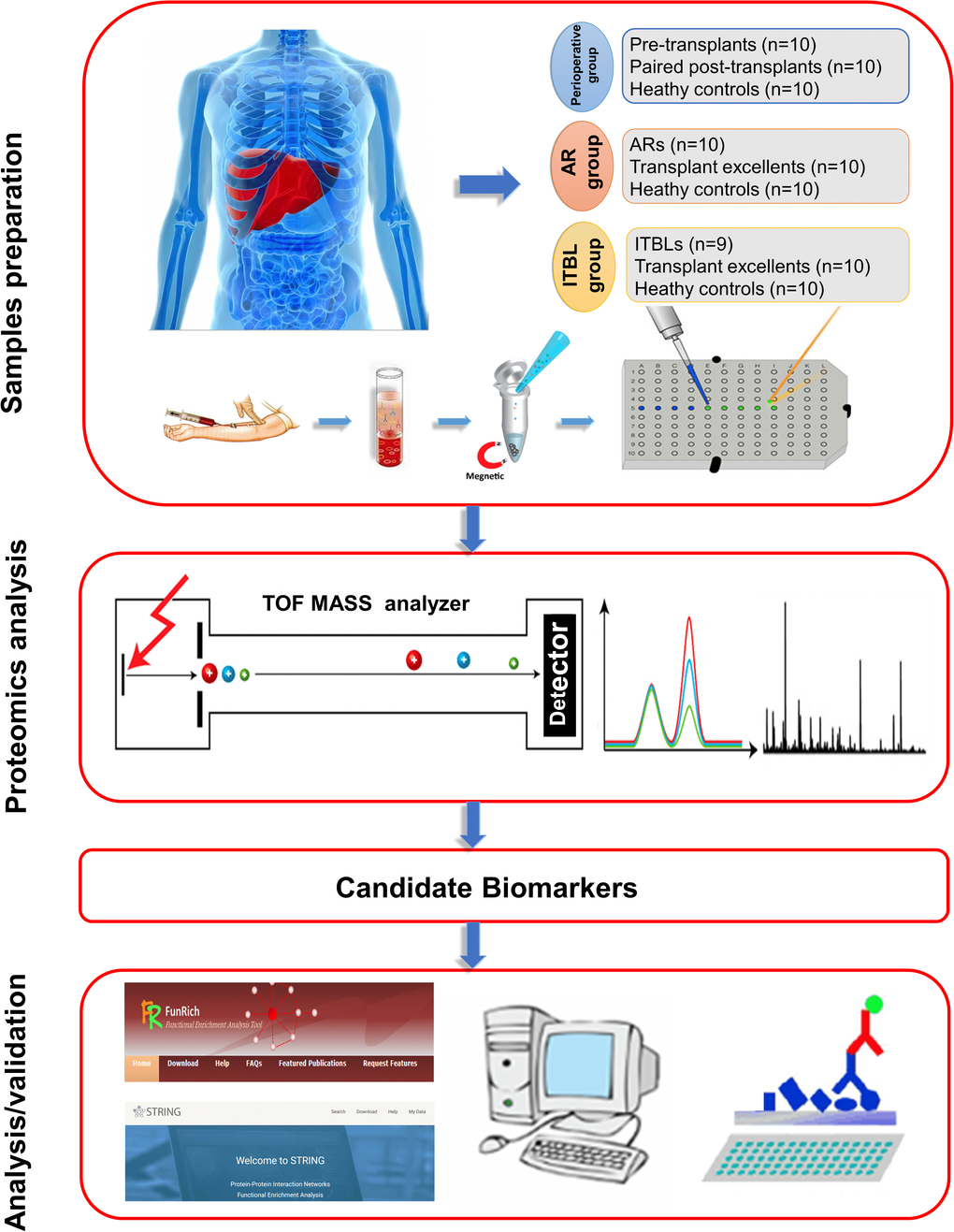 In the present study, the serum samples from paired pre- and post-transplant patients, AR patients, ITBL patients, and healthy controls were analyzed by magnetic bead-based weak cation exchange (MB-WCX) purification and MALDI-TOF MS and significant differentially-expressed peaks were selected. ATP citrate lyase (ACLY), fibrinogen alpha chain (FGA) and apolipoprotein A1(APOA1) were identified as potential biomarkers by sequencing and bioinformatic analysis. Finally, the positive correlation between these three biomarkers and clinical information was evaluated, and their exact expressions were validated by enzyme-linked immunosorbent assay (ELISA) and western blot analysis (Figure 1). Herein, we identified ACLY, FGA and APOA1 as serum biomarkers for the diagnosis of complications related to liver transplantation for the first time. Our results demonstrate the potential value of these proteins in assessing the effectiveness of liver transplantation.