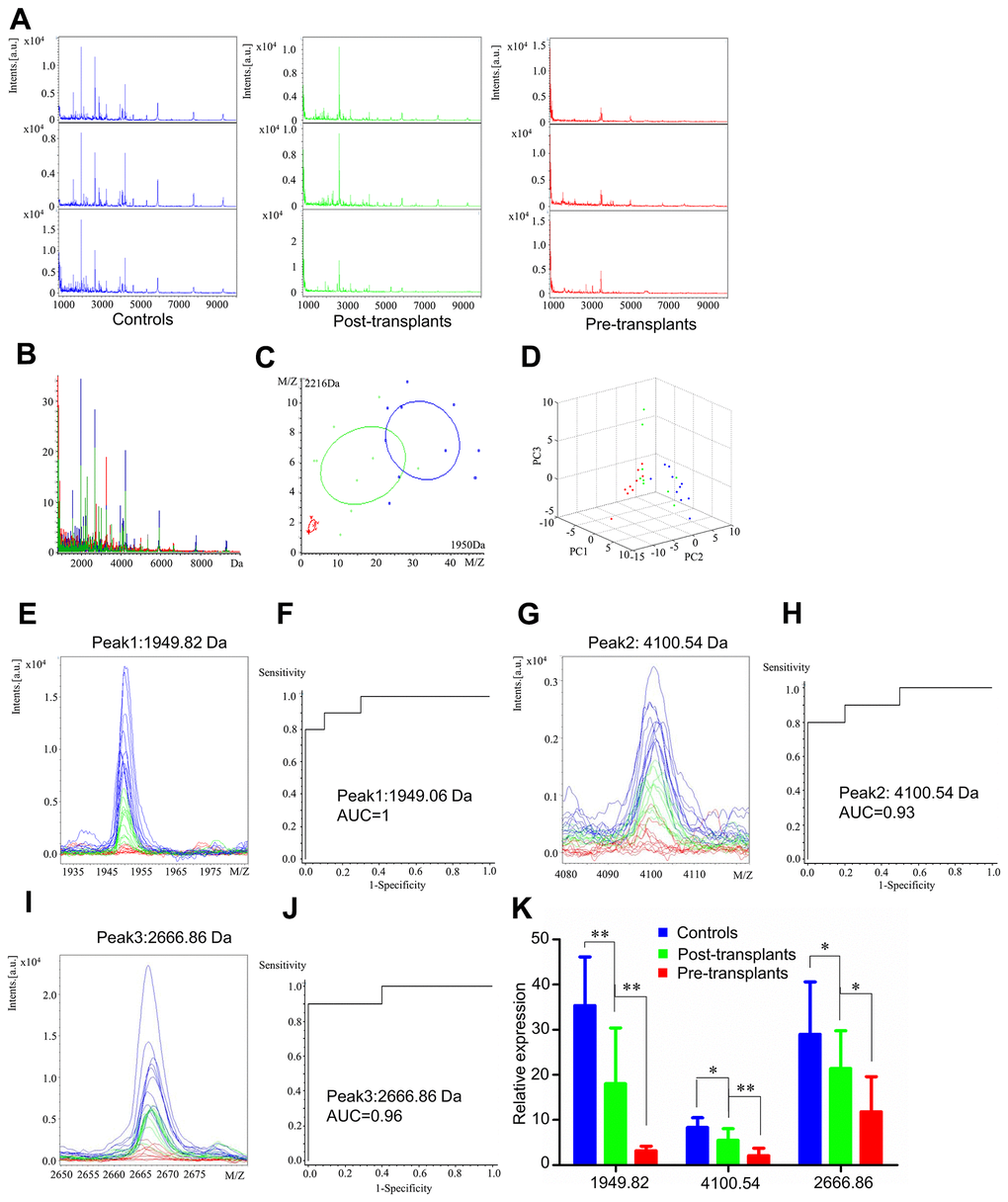 Comparison of the spectra of these three peaks and their receiver operating characteristic (ROC) curves and area under the curve (AUC) values are displayed in Figure 2. After transplantation, these three peaks showed a tendency to return to levels as in healthy control (Figure 2E, 2G, and 2I). The AUC values of peaks 1, 2, and 3 were 1 (Peak 1, m/z: 1949.06), 0.93 (Peak 2, m/z: 4100.54), and 0.96 (Peak 3, m/z: 2666.86), respectively (Figure 2F, 2H, and 2J). Comparison of the spectra among healthy controls, paired post-transplant, and pre-transplant patients and their mean expression levels are shown in Figure 2K.