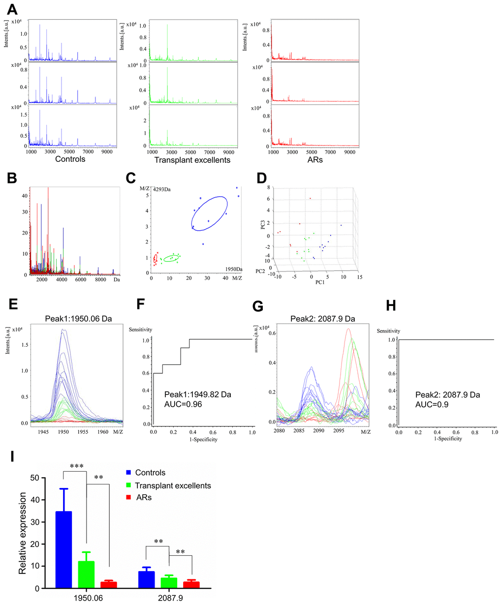 We analyzed serum proteomic profiles in the AR group (healthy controls, transplant excellent patients and AR patients). Representative mass spectra of three samples and overall sum of the spectra differed in healthy controls, transplant excellent patients, and AR patients in the mass range from 1 to 10 kDa (Figure 3A and 3B). Figure 3C and 3D showed little overlapping region in principal component analysis for the AR group. ClinProTools analysis revealed 80 different peaks, of which two peaks (Peak 1, m/z: 1950.06; Peak 2, m/z: 2087.9) differed significantly among the AR group (fold change > 1.5; p < 0.001). Peaks 1 and 2 were significantly downregulated when comparing AR patients and transplant excellent patients to healthy controls (Supplementary Table 3).