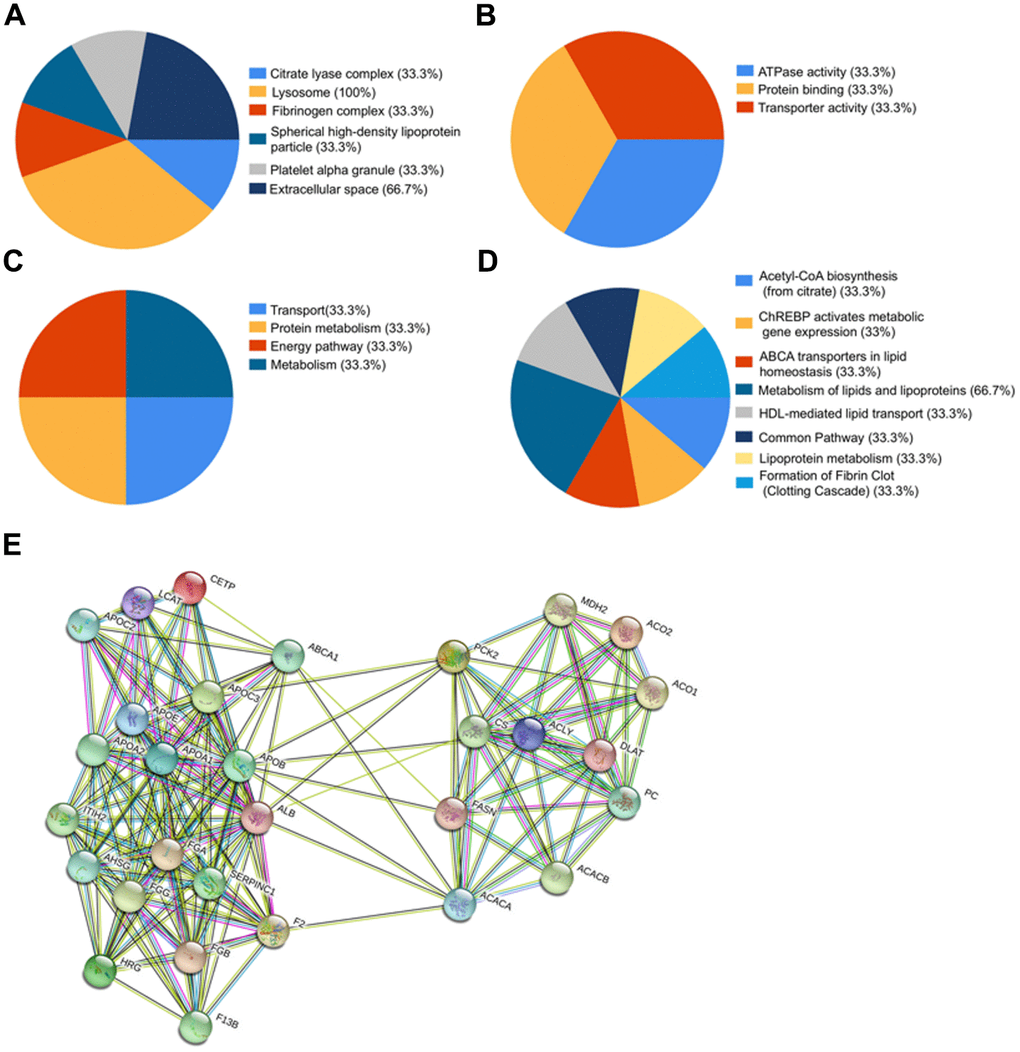 To further investigate the potential function and role of the three proteins, we performed FunRich analysis, and the results are shown in Figure 5A–5D. Firstly, the cellular component ontology described the subcellular structures and macromolecular complexes, and could therefore be used to annotate cellular locations of gene products. The identified proteins were scattered among various cellular components, including the lysosome (100%), extracellular space (66.7%), citrate lyase complex (33.3%), fibrinogen complex (33.3%), spherical high-density lipoprotein particle (33.3%), and platelet alpha granules (33.3%) (Figure 5A). Secondly, the molecular function analysis described the major functions of identified protein patterns, such as ATPase activity (33.3%), protein binding (33.3%), and transporter activity (33.3%) (Figure 5B). Thirdly, the three proteins were involved in a wide range of biological processes, including transport (33.3%), protein metabolism (33.3%), energy pathway (33.3%), and metabolism (33.3%) (Figure 5C). Finally, the biological pathway analysis demonstrated that these proteins were mainly involved in metabolism of lipids and lipoproteins (66.7%), acetyl-CoA biosynthesis (from citrate) (33.3%), ChREBP activates metabolic gene expression (33%), ABCA transporters in lipid homeostasis (33.3%), HDL-mediated lipid transport (33.3%), common pathway (33.3%), lipoprotein metabolism (33.3%), and formation of fibrin clots (clotting cascade) (33.3%) (Figure 5D). Overall, these proteins are very likely to play major roles in the metabolism of lipids and lipoproteins, pyruvate metabolism, and clotting cascade.