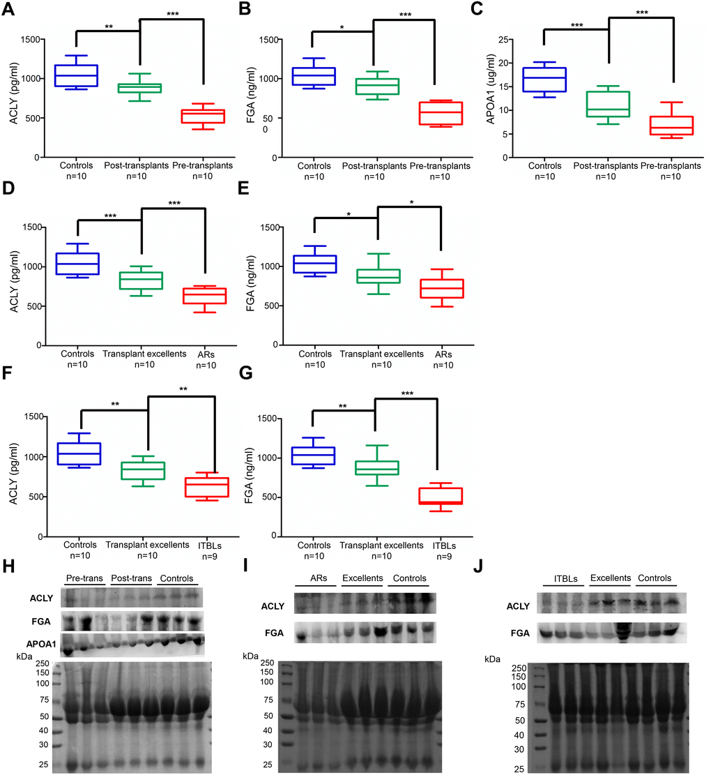 All results indicated that ACLY, FGA, and APOA1 were all expressed at significantly lower levels in pre-transplant, AR, and ITBL patients compared to the other subjects, showing the same tendency as the proteomics. Finally, western blot analysis was performed to verify the relative serum expression changes for the identified proteins in different groups (Figure 6H–6J). Taken together, both ELISA and western blot results further verified the credibility of our proteomic analysis.