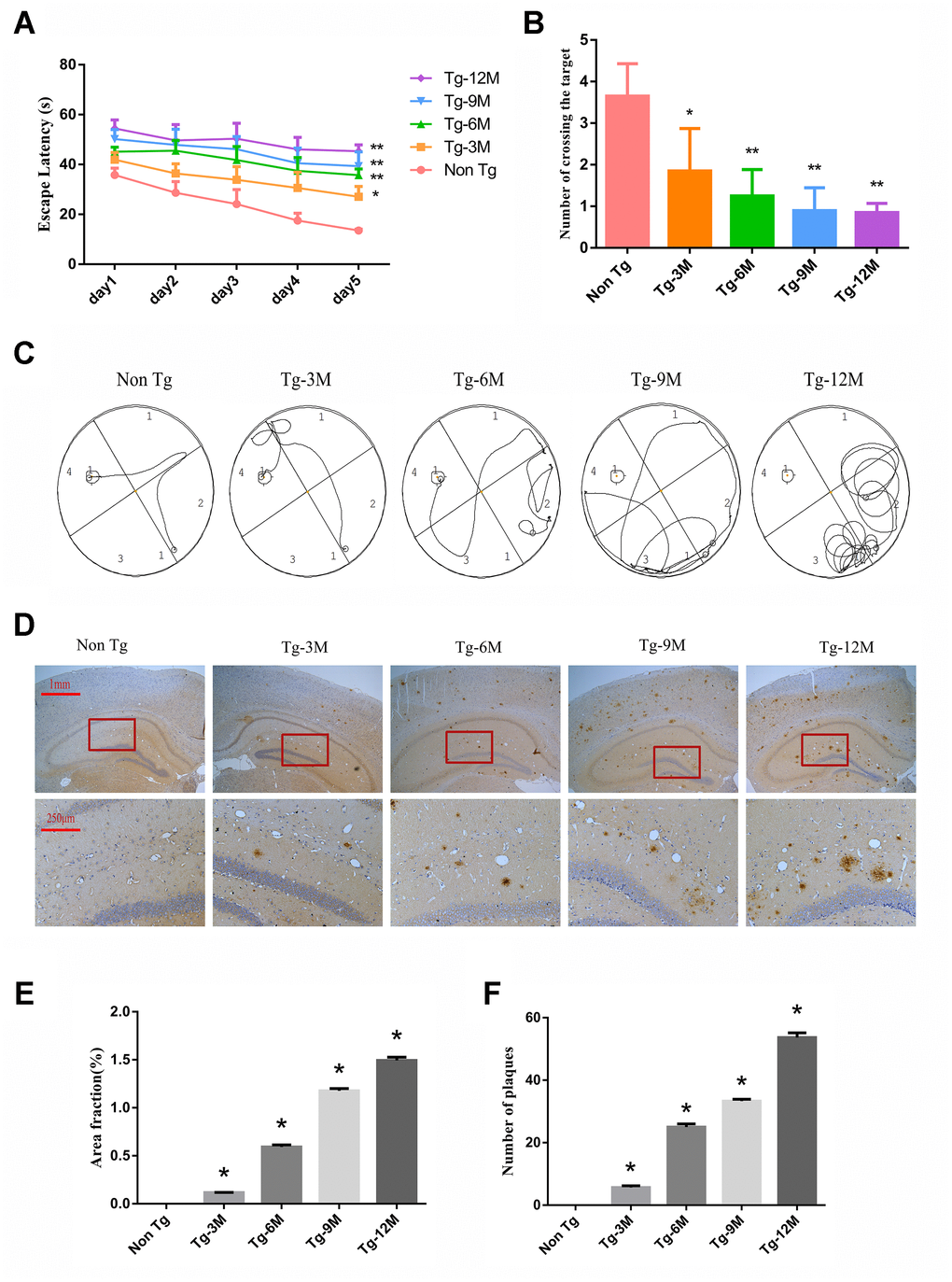 The Morris water maze (MWM) is widely used to assess hippocampus-dependent spatial learning and memory. In the MWM task, a test mouse or rat must find a hidden (submerged) escape platform in a circular pool filled with opaque water by using the surrounding visual landmarks [28]. During the learning phase (Figure 1A), 3-month-old AD model transgenic (Tg-3M) mice demonstrated significantly longer times to find the escape platform (longer escape latencies) compared to age-matched WT littermates (Non-Tg mice) (P < 0.05). Furthermore, average escape latency increased significantly with age in the Tg group (P < 0.01, P < 0.01). In the probe test for spatial memory retention (Figure 1B), Tg-3M mice made significantly fewer crossings of the former platform location than Non-Tg mice and the platform crossing frequency decreased with age (all P< 0.001). Representative swim paths are shown in Figure 1C.