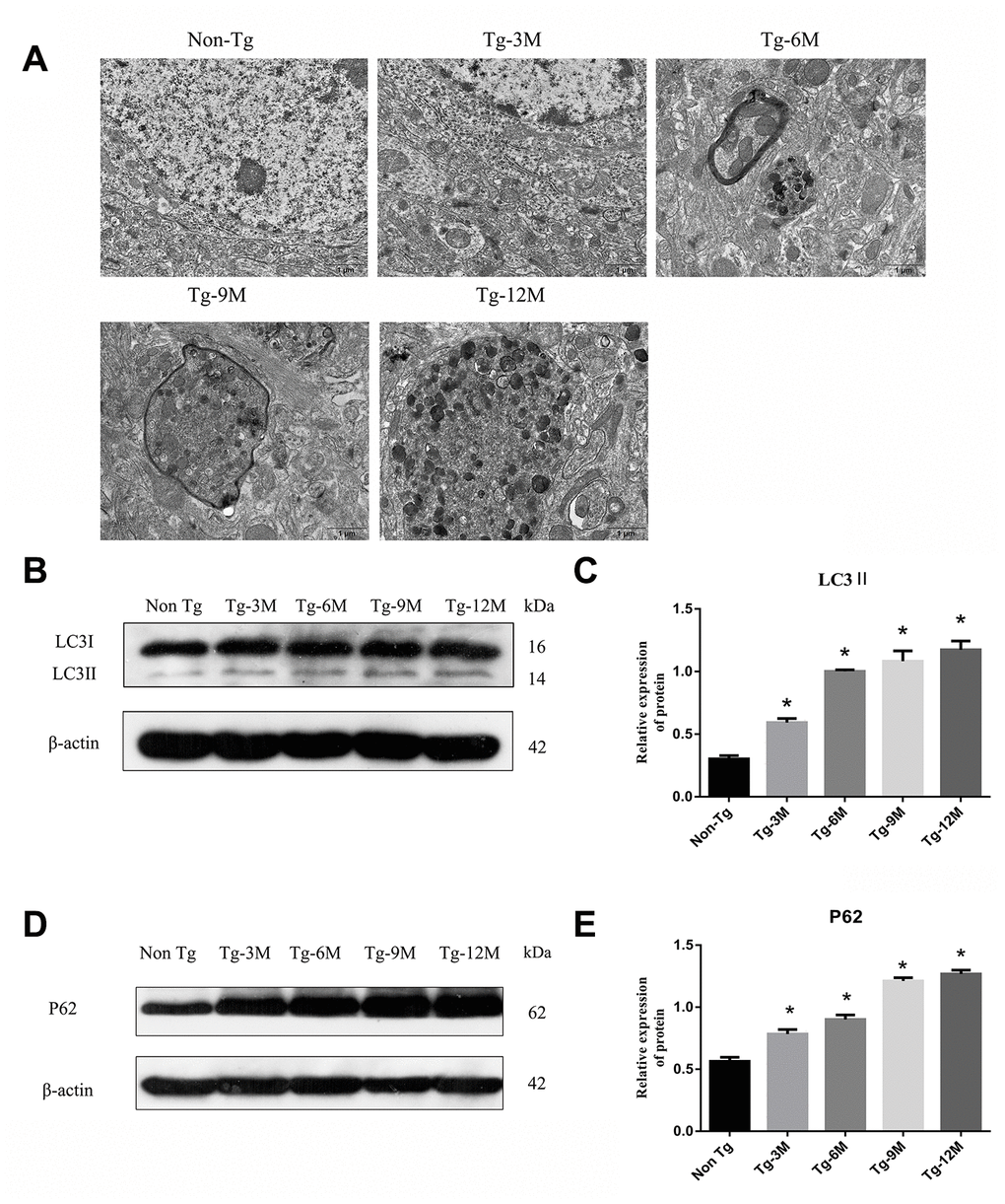 Transmission electron microscopy (TEM) revealed no autophagic structures in Non-Tg or Tg-3M hippocampi, but autophagosome number appeared to increase with age in the hippocampus of Tg mice, mainly accumulating in the axons and surrounded by microtubule-like structures (Figure 2A). Microtubule-associated protein 1 light chain 3 beta 2 (LC3II) is a phosphatidylethanolamine-conjugated autophagosome membrane protein and P62 (sequestosome 1) is a substrate of autophagic degradation used extensively as markers to monitor the progression of autophagy [8, 29]. As shown in Figure 2B and 2C, LC3II immunoexpression was significantly higher in Tg-3M mice than in Non-Tg mice, suggesting autophagic activation in the early stage of AD (P < 0.001). Moreover, LC3II expression remained higher in 6-month-old Tg mice (Tg-6M), Tg-9M mice, and Tg-12M mice compared to Non-Tg mice (all P < 0.001). In addition, consistent with autophagic activation, P62 expression was significantly higher in Tg-3M mice than in Non-Tg mice (P < 0.001) (Figure 2D and 2E) and remained higher in Tg-6M, Tg-9M, and Tg-12M mice than in Non-Tg mice (all P < 0.001).
