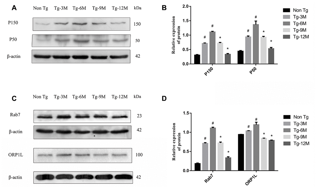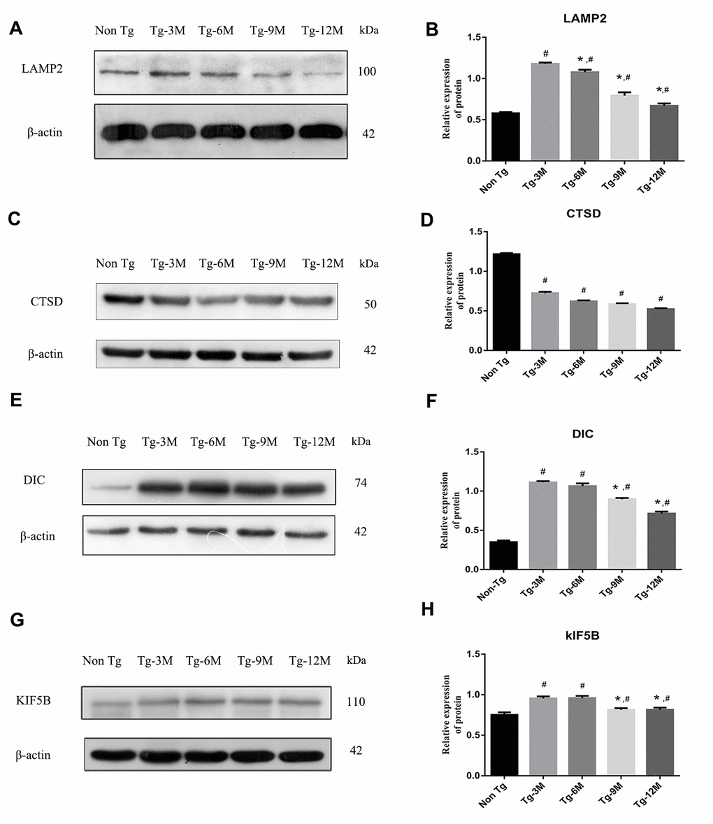 The maturation of autophagosomes depends on the axonal transport from distal axons to the cell body along microtubules and subsequent fusion with lysosomes. Therefore, the molecular motors dynein and kinesin, which drive retrograde and anterograde axonal transport, respectively, are critical for autophagosome maturation. The expression of both DIC and kinesin family member 5B (KIF5B) (Figure 3E–3H) was elevated in Tg-3M and Tg-6M mice compared to that in Non-Tg mice (all P < 0.000). However, the expression of DIC and KIF5B were reduced in Tg-9M and Tg-12M mice compared to that in Tg-3M mice (both P < 0.001).