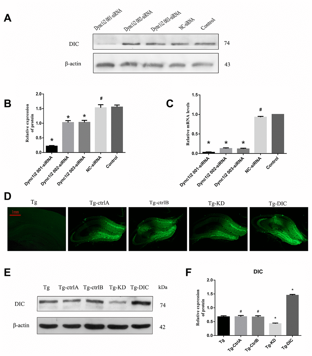 pAAV-SYN-MCS-EGFP-3FLAG-miR30shRNA(Dync1i2), pAAV-SYN-Dync1i2-2A-EGFP-3FLAG, pAOV-SYN-MCS-EGFP-3FLAG and pAAV-SYN-MCS-EGFP-3FLAG were from Obio Technology (Shanghai, China). The plasmids si-m-Dync1i2_001(CGAAGAGAATGATAGCAAA), si-m-Dync1i2_002(GGTGCTAAGCTGTCATTAA), si-m-Dync1i2_003(GGACAACTAAGAATAACAA), si-m-NC were constructed by Ribo Biotechnology Company(Guangzhou, China). Rabbit anti-β-actin, rabbit anti-LC3B-Specific, rabbit anti- P50, rabbit anti-KIF5B and rabbit anti-P62/SQSTM1 were purchased from Proteintech (US). Mouse anti-P150 was tought from BD. Mouse anti-DIC was bought from Millipore. Mouse anti-Rab7 and rabbit anti-Lamp2 were purchased from Abcam. Mouse anti-4G8(β-Amyloid, 17-24) was bought from Biolegend. All the secondary antibodies were purchased from Bioworld Technology.