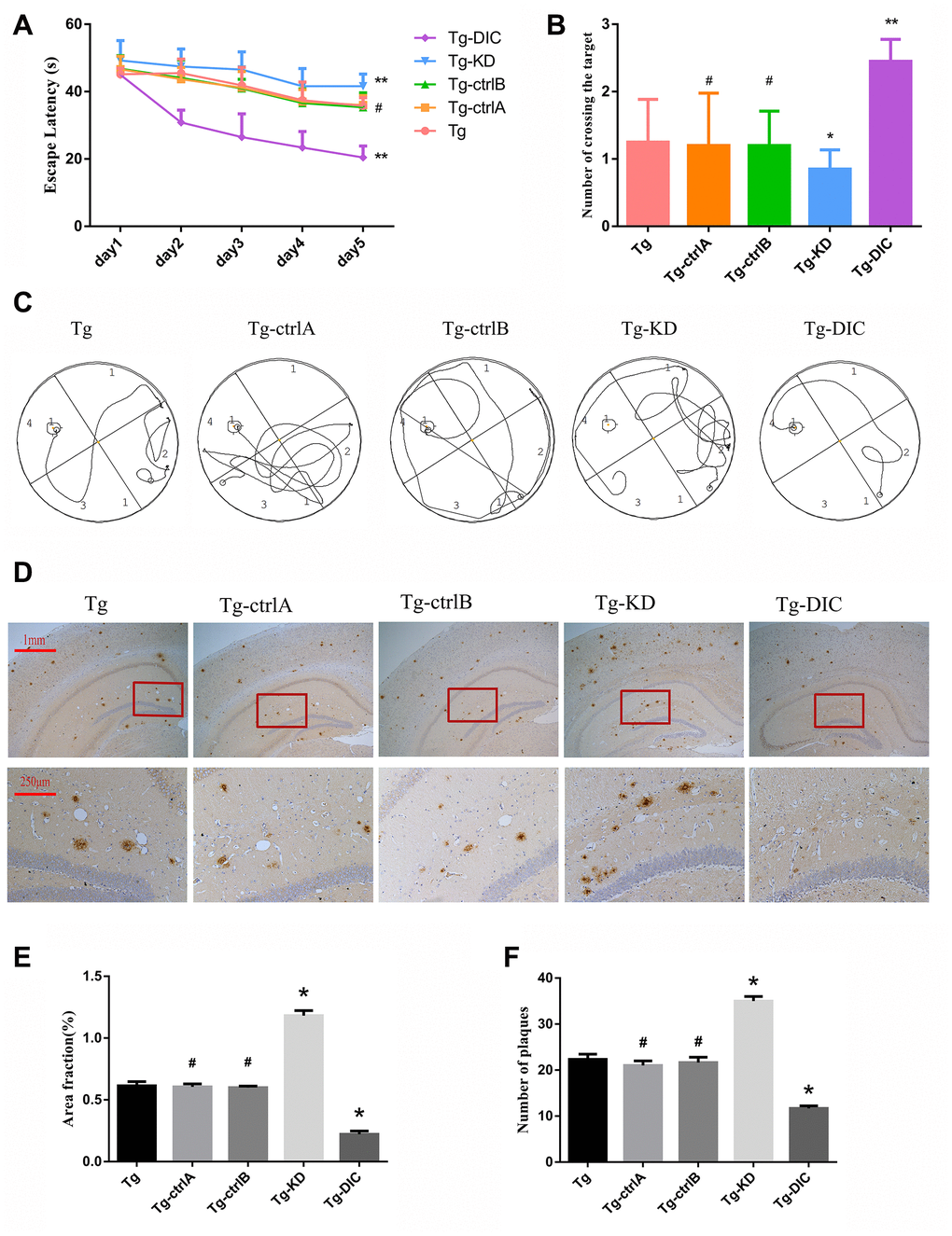 Immunohistochemical staining revealed a greater Aβ amyloid plaque area in the hippocampus of Tg-KD mice (P = 0.000) and significantly reduced area in Tg-DIC mice (P = 0.000) compared to Tg mice (Figure 6D). Alternatively, plaque area did not differ between Tg mice and either Tg-ctrlA or Tg-ctrlB mice (P = 0.723, P = 0.570) (Figure 6E). The number of amyloid plaques in the hippocampus was also significantly greater in Tg-KD mice than in Tg mice (P < 0.001), but it was significantly lower in Tg-DIC mice (P < 0.001). Similar to plaque area, plaque number did not differ between Tg mice and either Tg-ctrlA or Tg-ctrlB mice (P = 0.134, P = 0.433) (Figure 6F).