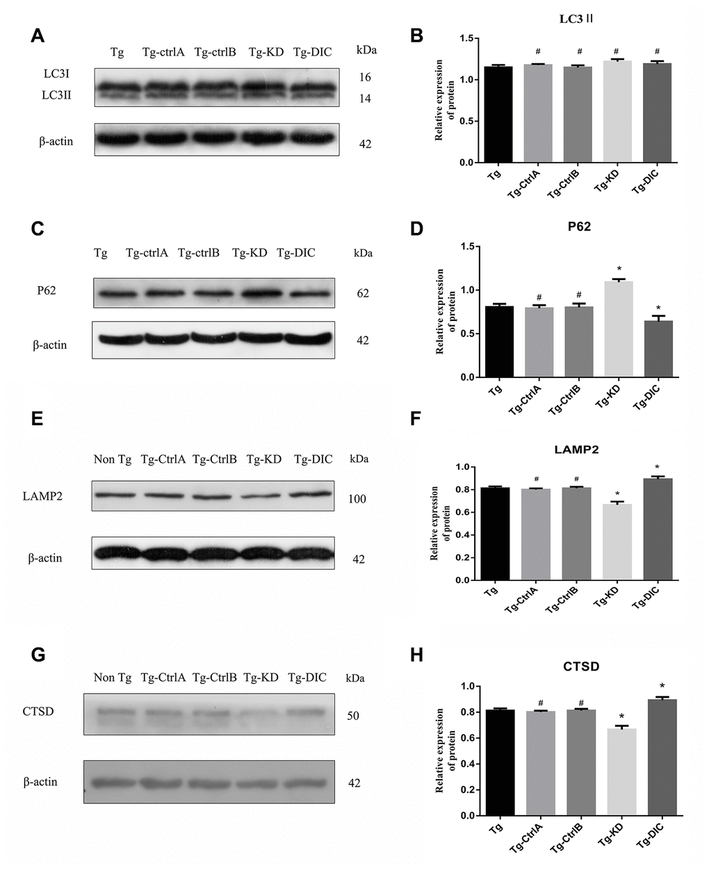 Compared to Tg mice, Tg-KD mice expressed significantly lower levels of the lysosome marker protein LAMP2 (P < 0.001), whereas Tg-DIC mice expressed significantly higher levels of LAMP2 than Tg mice (P=0.001) (Figure 7G, 7H). There was no significant difference in the expression between Tg mice and either Tg-ctrlA or Tg-ctrlB mice (P = 0.509, P = 0.999). The expression of CTSD was also significantly lower in Tg-KD mice than in Tg mice (P < 0.001), whereas the expression of CTSD was greater in Tg-DIC mice than in Tg mice (P < 0.001) (Figure 7G, 7H). Again, there was no significant difference in CTSD expression between Tg mice and either Tg-ctrlA or Tg-ctrlB mice (P = 0.836, P = 0.742).
