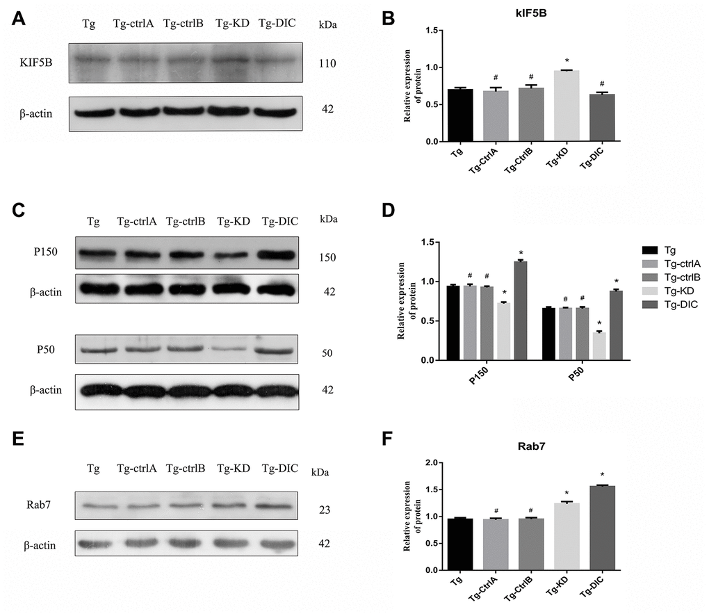The expression of KIF5B was significantly higher in Tg-KD mice (P < 0.001) and lower in Tg-DIC mice compared to that in Tg mice, whereas there were no significant differences among Tg, Tg-ctrlA, and Tg-ctrlB mice (all P > 0.05) (Figure 8A, 8B). Alternatively, the expression levels of P150 and P50 were significantly lower in Tg-KD mice (both P < 0.001) and higher in Tg-DIC mice (both P < 0.000) compared to those in Tg mice, but did not differ among Tg, Tg-ctrlA, and Tg-ctrlB mice (all P > 0.05) (Figure 8C, 8D). Finally, Rab7 expression was enhanced in both Tg-KD mice and Tg-DIC mice compared to Tg mice (P < 0.001), but did not differ in Tg-ctrlA or Tg-ctrlB mice (P = 0.715, P = 0.920) (Figure 8E, 8F).