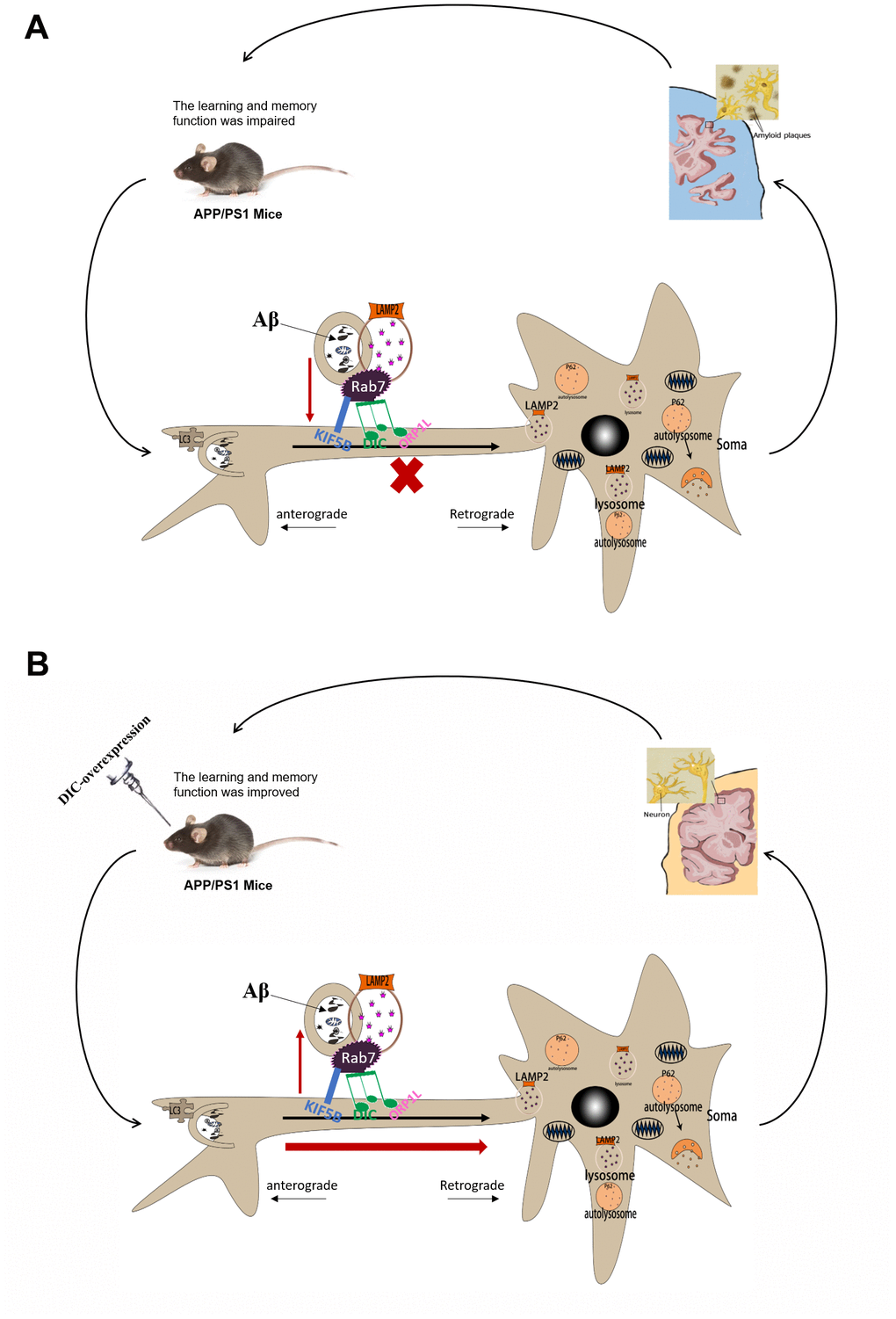 In conclusion, autophagy is activated in the hippocampus of young APP/PS1 double transgenic mice but exhibits age-dependent impairment, which leads to the accumulation of insoluble Aβ and autophagosomes (Figure 9A). The overexpression of DIC sustained autophagy, thereby reducing Aβ accumulation and rescuing hippocampal dysfunction (Figure 9B). Therefore, autophagic regulatory proteins are potential targets for AD treatment. One outstanding question warranting further study is why both knockdown and overexpression of DIC enhanced Rab7 expression. Therefore, in future research, we will continue to explore the effects of DIC on autophagic flux and autophagosome axonal transport in vitro to provide new insights and evidence for use in the treatment of AD.