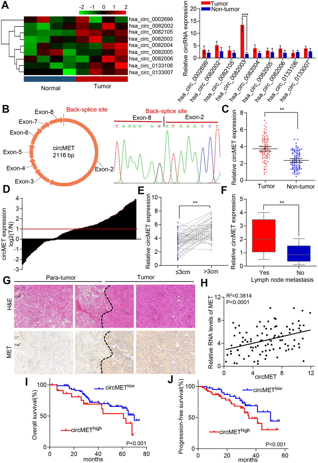 Dysregulation of MET oncogene-mediated cell motility, invasion, and metastasis has been widely documented among many different types of cancer, including NSCLC [22, 23]. Based on this point, we hypothesized that the accumulation of circRNA-derived MET might act as a tumor promoter in NSCLC cells. Therefore, we used circular RNA sequencing data from circBase to identify and screen 9 candidate circRNAs derived from MET genes. To further examine the levels of circRNA expression in NSCLC patients, 4 pairs of NSCLC tissue samples and their corresponding peritumoral tissues were analyzed by qRT-PCR. Among the 9 differentially expressed circRNAs, circMET (hsa_circ_0082003) expression was found to be significantly upregulated in NSCLC tissues relative to that in paired adjacent normal lung tissues (Figure 1A). In addition, the sequence of circMET consisting of 8 exons had a length of 2116 nucleotides (Figure 1B). To investigate the clinical role of circMET in NSCLC patients in detail, we detected the expression of circMET in 94 pairs of NSCLC tissues and matched adjacent nontumor lung tissues. The results indicated that circMET expression was significantly increased in 94 lung cancer tissues (P < 0.001, Figure 1C and 1D). We next sought to investigate the relationship between the circMET expression level in NSCLC tissues and the specific clinicopathological characteristics of NSCLC patients. As shown in Table 1, increased circMET expression in NSCLC was significantly correlated with differentiation, tumor size and lymph node metastasis (Figure 1E and 1F; Table 1). In addition, IHC staining showed that MET expression was significantly higher in NSCLC tumor tissues than in peritumoral tissues, as expected (Figure 1G). Notably, a positive correlation between circMET and MET was observed in the NSCLC tissues (Figure 1H). Moreover, Kaplan-Meier survival curves revealed that patients with circMEThigh expression were related to poor overall survival (OS) and progression-free survival (PFS) after surgery (Figure 1I and J). Together, these findings suggest that high circMET expression is likely a key promoter in the progression of NSCLC cells and serves as an independent prognostic biomarker for NSCLC patients.
