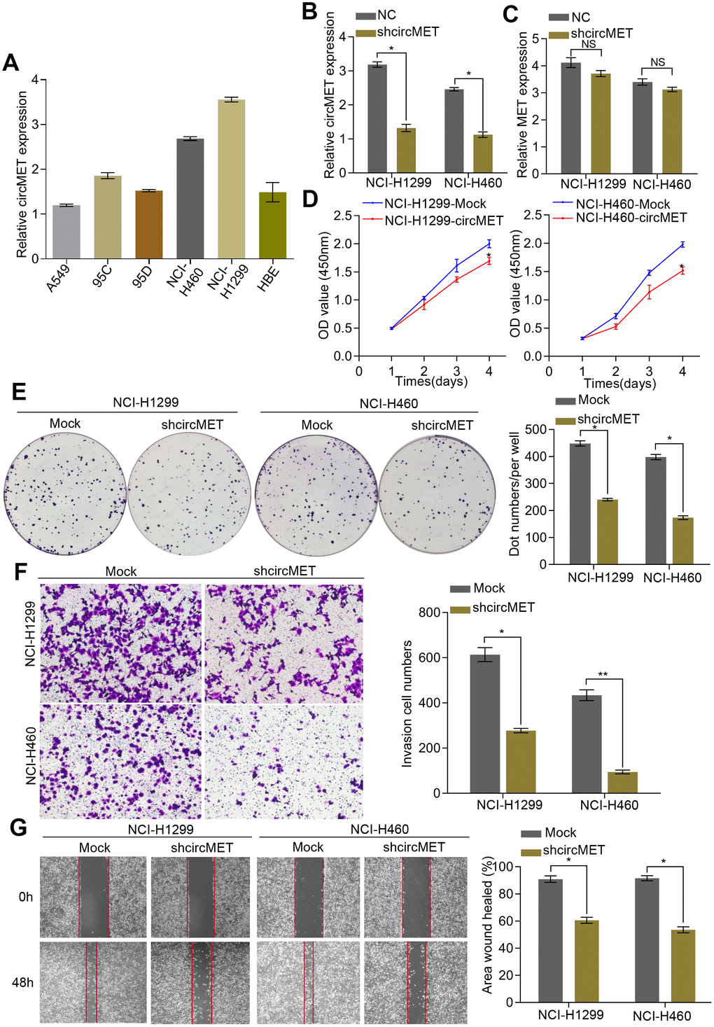 Initially, we examined circMET expression levels in a variety of human NSCLC cell lines by RT-qPCR analyses. (Figure 2A). To further characterize the biological function of circMET in NSCLC cells, we next effectively silenced circMET expression in NCI-H460 and NCI-H1299 cells by transfection with specific shRNA (sh-circMET) (Figure 2B) and successfully forced circMET expression in A549 and 95D cells using the plasmid vector (Supplementary Figure 1A). However, qRT-PCR showed that other MET splicing products, such as the MET mRNA, had no significant effects on the expression level. In vitro Cell Counting Kit-8 (CCK-8), wound healing, migration, clone formation, and invasion assays revealed that expression was significantly suppressed in circMET knockdown NCI-H460 and NCI-H1299 cell lines compared with that in the mock control cell lines (Figure 2C–2G). Conversely, overexpressing circMET promoted the growth and migration of NSCLC cells (Supplementary Figure 1B–1E).