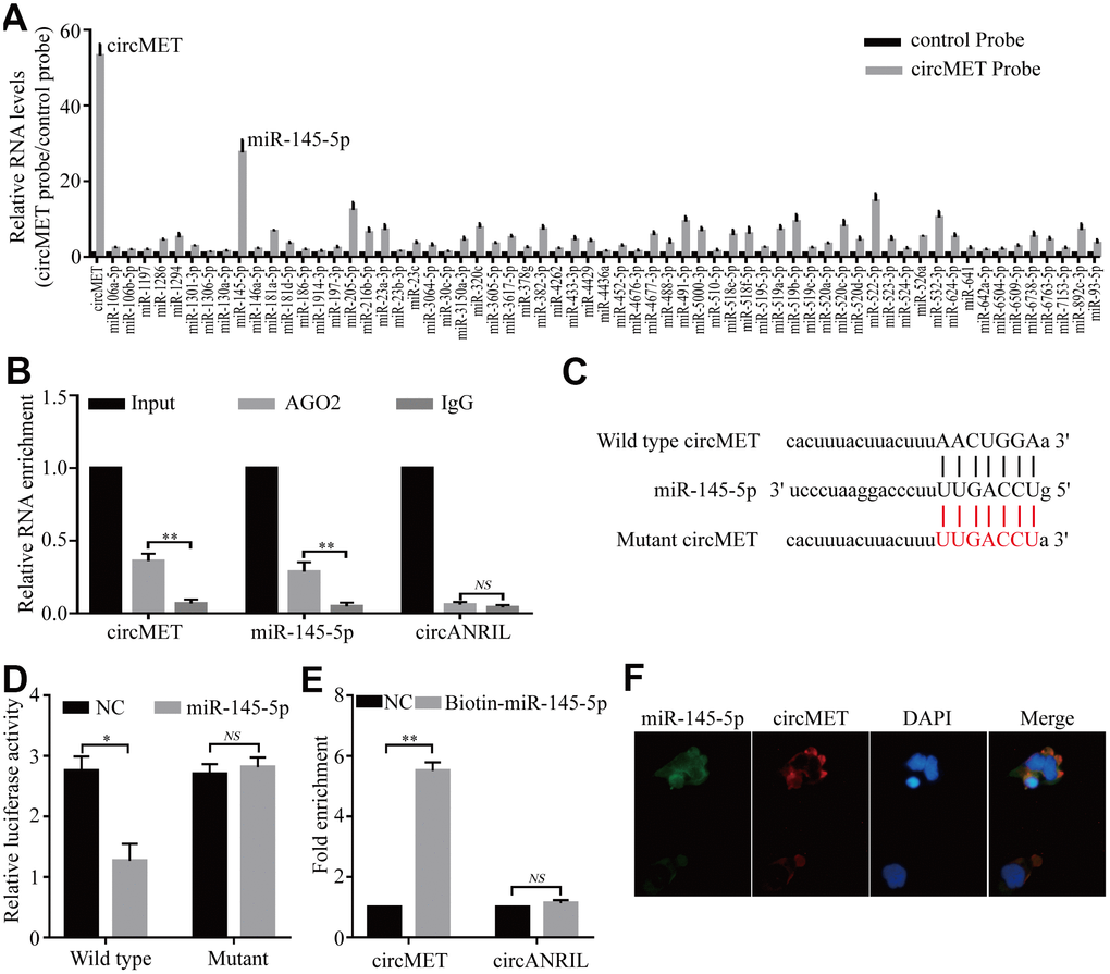 Numerous previous studies have demonstrated that circRNAs are involved in transcriptional regulation by serving as miRNA sponges in cancer cells [24, 25]. Therefore, we attempted to explore whether circMET could bind to certain miRNAs in NSCLC progression. To confirm this idea, we next identified several potential miRNA candidates as a binding platform of circMET based on the StarBase v3.0 target prediction tool. After performing in vivo RIP with a probe specifically against circMET in A549 cells, we purified the cMET-associated RNAs by circRIP and analyzed the 63 candidate miRNAs in the complex. Interestingly, our results showed that the circMET and miR-145-5p levels were significantly enriched with the specific probe compared with those with the NC probe, while the other miRNAs had no or marginal enrichment (Figure 3A). Based on this, miR-145-5p may function as a critical miRNA that could bind to circMET in NSCLC cells.