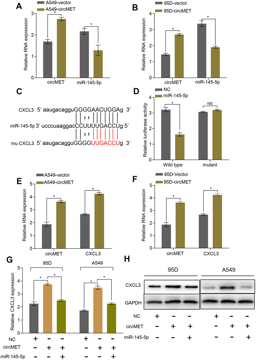 Here, we first analyzed the gene expression profiles of mesenchymal epithelial transition factor receptor (MET)-derived circRNAs in human NSCLC tissues and paired adjacent normal lung tissues. Importantly, we presented the oncogenic role of circMET (also known as hsa_circ_0082003 in circBase), which was significantly upregulated in NSCLC tissues and is closely associated with the poor prognosis of NSCLC patients. Furthermore, we identified that circMET could promote the progression of NSCLC cells by sponging oncogenic miR-145-5p [18, 19] to upregulate chemokine (C-X-C motif) ligand 3 (CXCL3) [20, 21] expression. Therefore, circMET may serve as a novel diagnostic biomarker and promising therapeutic target for NSCLC patients.