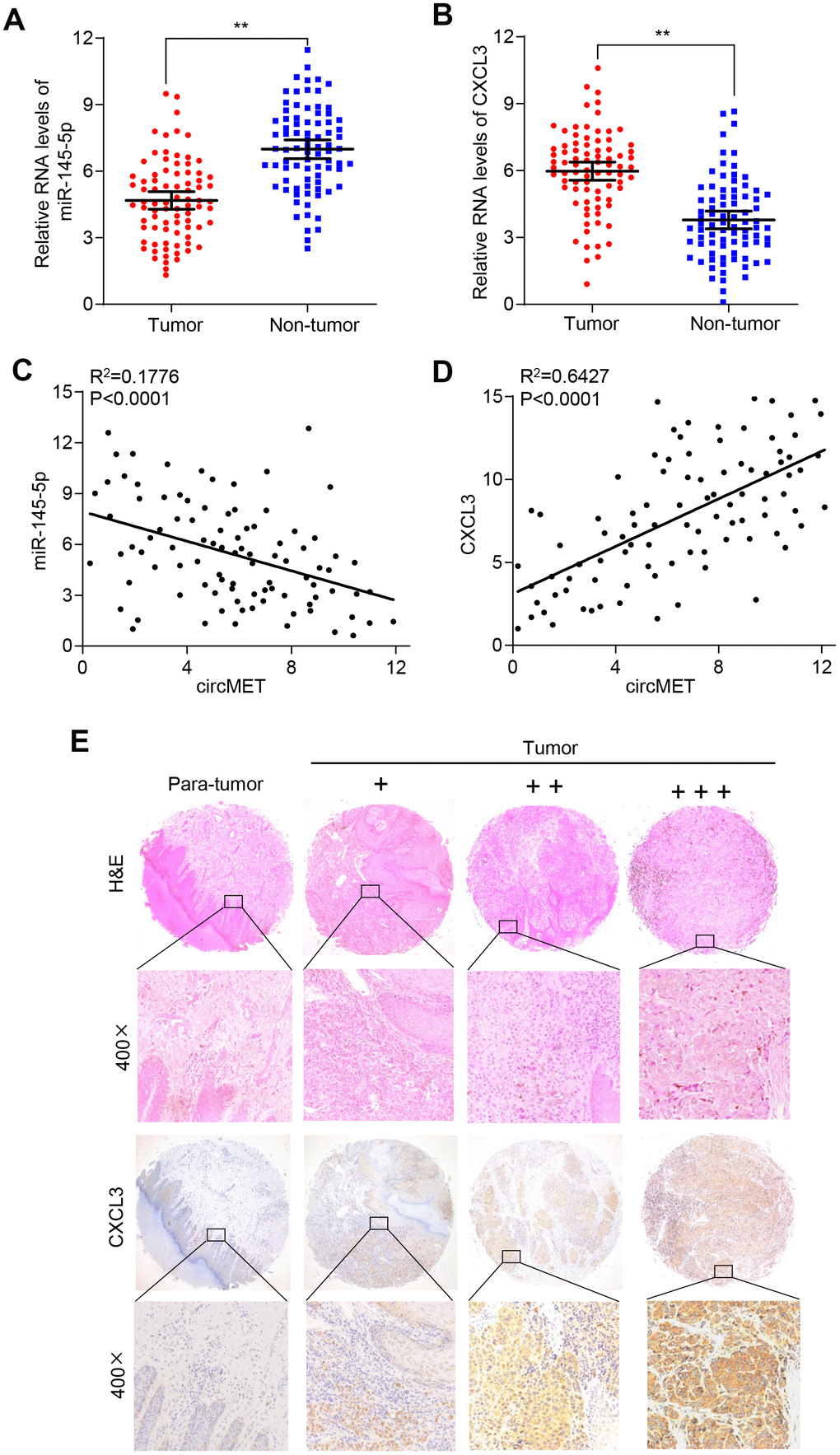 To verify whether circMET expression could affect the levels of CXCL3 mRNA and protein in NSCLC progression, qRT-PCR and Western blot analyses were individually performed to examine their changes after overexpressing or silencing circMET and miR-145-5p in NSCLC cells. As expected, we found that the mRNA and protein levels of CXCL3 significantly increased after knockdown of miR-145-5p expression in A549 and 95D cells. Consistent with this, the circMET and CXCL3 expression levels were significantly increased after transfection of the circMET overexpression vector into NSCLC A549 and 95D cells (Figure 4E and 4F). Interestingly, the resulting increase in the CXCL3 mRNA and protein levels induced by circMET overexpression could be partially reversed by upregulation of miR-145-5p (Figure 4G and 4H). Next, using qRT-PCR analysis, we also investigated miR-145-5p and CXCL3 expression in 94 paired NSCLC tissues and their corresponding adjacent normal tissues. The results indicated that miR-145-5p expression was significantly downregulated in NSCLC tissues (Figure 5A). Conversely, the expression of CXCL3 was elevated (Figure 5B). Furthermore, negative correlations between circMET and miR-145-5p were observed in the NSCLC tissues (Figure 5C). In contrast, correlations between circMET and CXCL3 had the opposite trend (Figure 5D). Then, we focused on CXCL3 protein expression between NSCLC tissues and paired adjacent normal tissues using TMAs. Not surprisingly, the overall protein level of CXCL3 in NSCLC tissues was markedly higher than that in matched adjacent normal tissues by H&E and immunohistochemical staining. Notably, the heterogeneity of the CXCL3 levels was observed in tumor samples (−, absent; +, weak; ++, moderate; and +++, strong) (Figure 5E). Furthermore, the oncogenetic role of CXCL3 had been verified in The Cancer Genome Atlas (TCGA) dataset (Supplementary Data 2D-2G and Data 4). Collectively, all of the above experiments indicated that circMET promoted the growth and metastasis of NSCLC via the miR-145-5p/CXCL3 pathway.