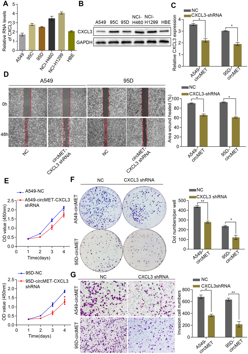 Additionally, we also detected CXCL3 mRNA and protein levels in a variety of human NSCLC cell lines (Figure 6A and 6B). Thus, we constructed a CXCL3 shRNA plasmid and detected the CXCL3 mRNA levels after transfection into NSCLC A549-circMET and 95D-circMET cells (Figure 6C). The results of the in vitro Cell Counting Kit-8 (CCK-8), wound healing, migration, clone formation, and invasion assays showed that compared with the NC cells, the A549-circMET and 95D-circMET cells with CXCL3 knocked down had significantly decreased malignant phenotypes (Figure 6D–6G). Taken together, these data suggested that CXCL3 knockout significantly inhibited NSCLC cell proliferation and migration induced by circMET and that CXCL3 was likely to be recognized as a potential diagnostic and prognostic biomarker for NSCLC patients.