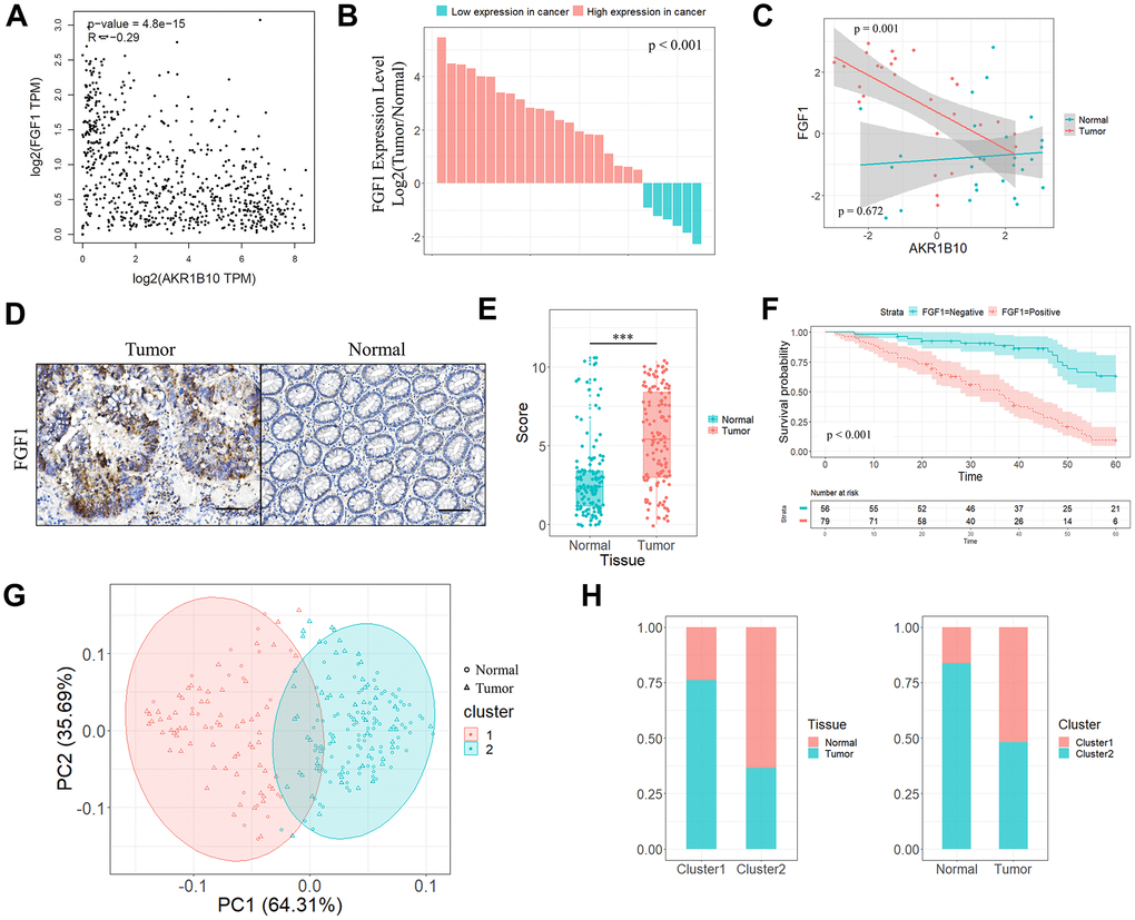 AKR1B10 is a potential biomarker of CRC, although the mechanisms underlying AKR1B10 down-regulation in CRC and AKR1B10-mediated tumorigenesis remain to be clarified. Overexpression of AKR1B10 significantly inhibited the proliferation and migration of CRC cells. Correlation analysis on TGCA datasets showed a significant association between AKR1B10 and FGF1. The latter is a member of the fibroblast growth factor family that is involved in cell proliferation and migration [39–41], and acts as an oncogene in several cancers. FGF1 is aberrantly expressed in pancreatic cancer, lung cancer, glioblastoma and prostate cancer [42–45]. Elevated FGF1 levels are associated with increased angiogenesis and decreased survival in serous ovarian adenocarcinoma [46], and is a potential therapeutic target for ovarian cancer [47, 48]. We found that FGF1 was overexpressed in CRC tissues and predicted poor prognosis. Furthermore, cluster analysis indicated that both FGF1 and AKR1B10 expression levels were able to distinguish between the tumor and adjacent normal tissues, and pointed to a functional relationship as well.