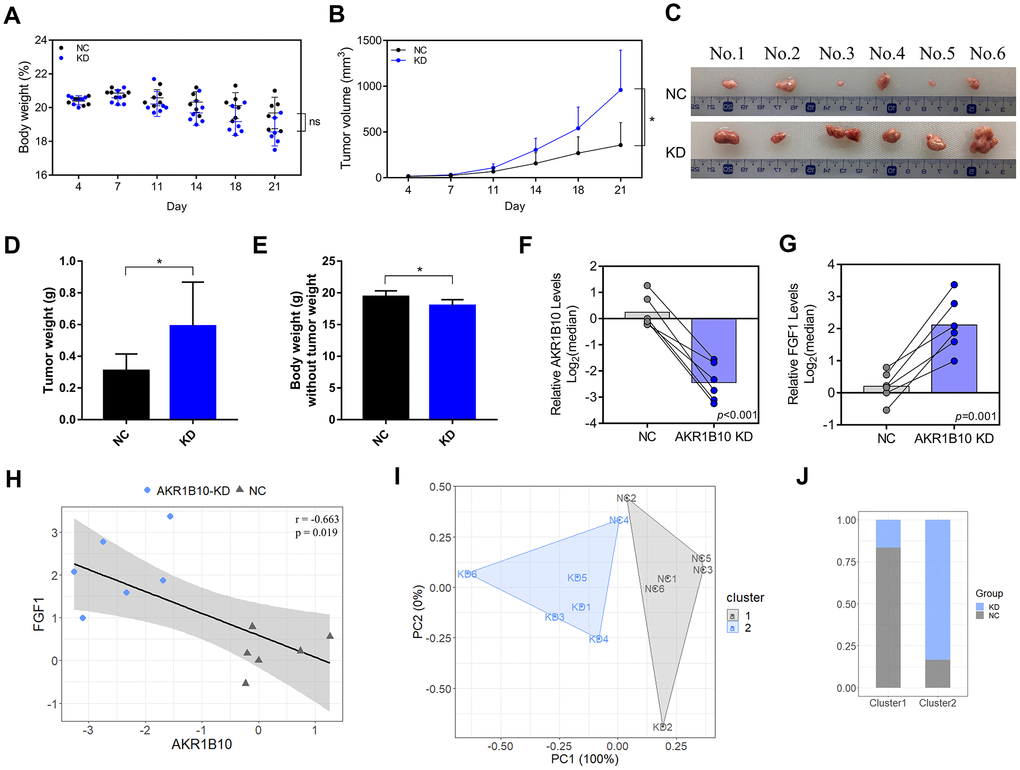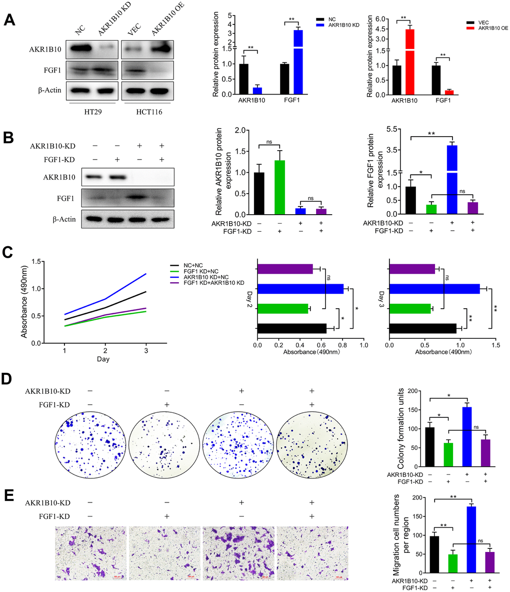 The role of AKR1B10 in CRC tumor growth was analyzed by establishing an in vivo xenograft model using wild-type and AKR1B10-KD HT29 cells. Depletion of AKR1B10 had no obvious effect on the body weight of the mice (Figure 4A), but significantly enhanced the proliferative capacity of the CRC cells, which was manifested as increased tumor size (Figure 4B) and weight (Figure 4C–4D) compared to control group. However, the net body weights obtained after subtracting the tumor weights were significantly lower in the mice implanted with AKR1B10-KD CRC cells (Figure 4E). Furthermore, in situ AKR1B10 mRNA levels were markedly lower and that of FGF1 was higher in the AKR1B10-KD tumors (Figure 4F–4G), and showed significant statistical correlation (Figure 4H). We next performed a cluster analysis to consider the combined effects of body weight, tumor volume, tumor weight and AKR1B10/FGF1 levels (Figure 4I), and found that 16.67% of the AKR1B10-KD and 83.33% of the NC group mice were in Cluster 1 (Figure 4J). To gain further mechanism insights, we analyzed the FGF1 levels in CRC cells transfected with AKR1B10-shRNA or AKR1B10 overexpression plasmid, and found that AKR1B10 downregulated FGF1 while knocking it down had the opposite effect (Figure 5A). To further determine the role of FGF1 in AKR1B10-mediated regulation of CRC progression, the HT29 cells were co-transfected with AKR1B10-shRNA and FGF1-shRNA. Interestingly, inhibiting AKR1B10 restored FGF1 expression levels following the latter’s knockdown (Figure 5B) but its overexpression did not rescue the CRC cells from the anti-proliferative effects of FGF1 knockdown (Figure 5C–5E). Taken together, AKR1B10-mediated inhibition of CRC cells is dependent on FGF1.