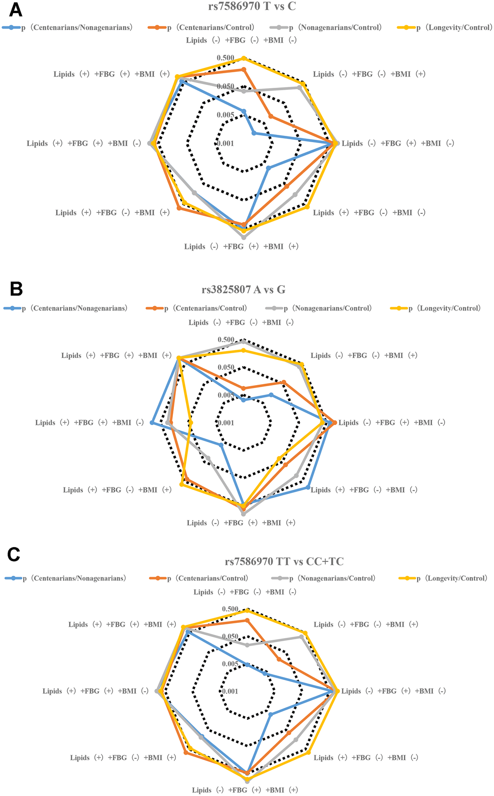To eliminate the influence of two alleles in one variant, we performed a stratified analysis of the relevance between alleles and metabolic phenotypes. The results showed that rs7586970 T is specifically correlated with the metabolic level of lipids (-) +FBG (-) +BMI (+) in centenarians. The rs7586970 T allele was specifically correlated with normal blood lipid and glucose metabolism levels in centenarians (Figure 2A, Supplementary Table 5).rs3825807 A showed a specific correlation with normal levels of lipids, FBG and BMI in centenarians (Figure 2B, Supplementary Table 5), and thus, rs7586970 T and rs3825807 A may represent a protective genetic marker of normal blood lipid and glucose levels in centenarians.