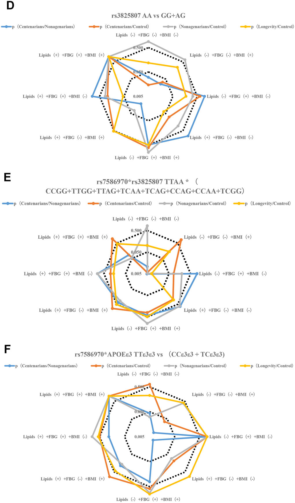 Stratification analysis of metabolic phenotype of TFPI rs7586970 and ADAMTS7 rs3825807. (D) Correlation analysis of genotype frequency of ADAMTS7 rs3825807 with metabolic phenotype. The rs3825807 recessive model (AA/AG+GG) showed a specific correlation with lipids (-) +FBG (-) + BMI (-/+) in centenarians. (E) Correlation analysis between the interaction of TFPI rs7586970 and ADAMTS7 rs3825807 with metabolic phenotype. TTAA has a specific and significant correlation with lipids (-) +FBG (-) +BMI (-) in centenarians. (F) Correlation analysis between the interaction of TFPI rs7586970 and APOE ε3 with metabolic phenotype. TTε3ε3 was specifically correlated with lipids (-) +FBG (-) +BMI (+) in centenarians.