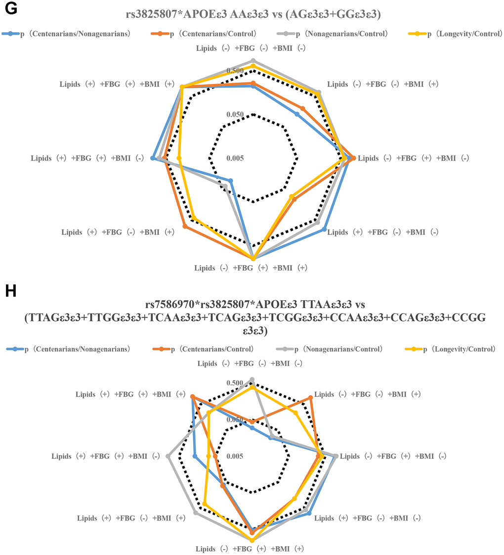 Stratification analysis of metabolic phenotype of TFPI rs7586970 and ADAMTS7 rs3825807. (G) Correlation analysis between the interaction of ADAMTS7 rs3825807 and APOE ε3 with metabolic phenotype. AAε3ε3 was not specifically correlated with BMI, blood glucose and lipid in centenarians. (H) Correlation analysis between interaction of TFPI rs7586970, ADAMTS7 rs3825807 and APOE ε3 with metabolic phenotype. AATTε3ε3 in the centenarians group showed a specific correlation with lipids (-) +FBG (-) +BMI (-).