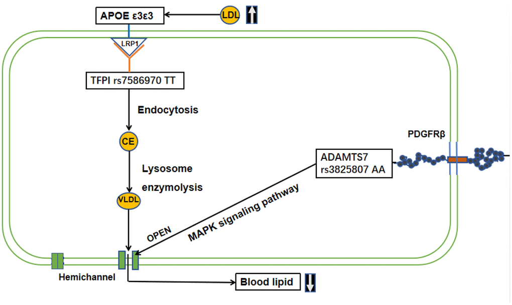 Mechanism or interactive pathway of TFPI, ADAMTS7 and APOE in lipid metabolism homeostasis in longevity. TFPI rs7586970 TT, with normal function, can be formed lipoprotein-associated coagulation inhibitor (LACI) through C-terminal region glycophosphatidylinositol (GPI) anchoring point by binding to LDL receptor (LDLR)-related proteins, known as Low-Density Lipoprotein Receptor Associated Protein 1(LRP1). APOE also regulates blood cholesterol levels by binding to LDLR. When the blood lipid concentration increases, APOE transport of lipids by binding to LRP1. Then, TFPI rs7586970 TT interacts with APOE via the LRP1to carry out endocytosis. After that convert lipid to cholesterol ester (CE). The CE is broken down into VLDL by enzymolysis in lysosomes. In the meantime, ADAMTS7 rs3825807 AA activates PDGFR-β enzyme activity to bond PDGF. The combination of PDGF and PDGFR-β can result in VSMC migration in the MAPK pathway. PDGFR-β is a typical tyrosine receptor kinase that activates downstream growth factors, such as receptor-binding protein 2 (Grb2), son of sevenless (Sos), Ras and other factors, activating the MAPK pathway and stimulating hemichannel opening to release VLDL into the extracellular environment or adjacent cells.