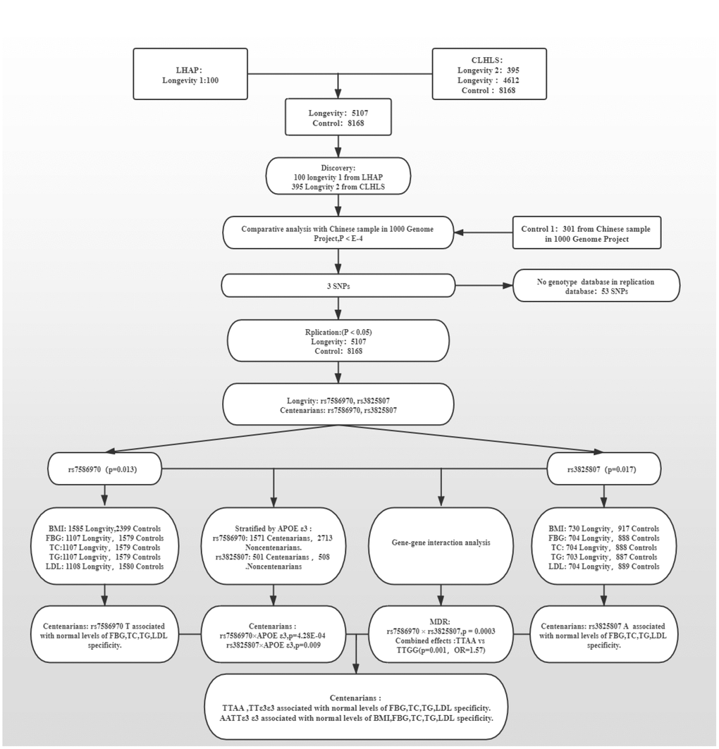 However, our study aimed to discover whether these risk or protective variants related to CVD in the population also have positive or negative effects associated with longevity. We assumed that these protective variants related to CVD may be the main causal determinants of a long and healthy life. Therefore, we developed a population study in healthy, long-lived Chinese subjects to explain the genetic mechanism of human longevity.