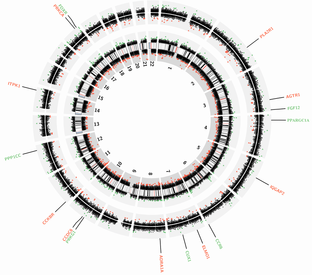 In the F1 generation, 961 differentially methylated sites (DMSs) (|Δβ|>0.05 and adjusted P<0.05) including 601 hypermethylated and 360 hypomethylated DMSs were identified. In the F2 generation, 503 DMSs (|Δβ|>0.05 and adjusted P<0.05) including 146 hypermethylated and 357 hypomethylated DMSs were identified. We constructed a genome-wide map of all autosomal DMSs (Figure 1). And only 19 of 961 F1 DMSs showed concordant alterations in F2 cohort, which may suggest that these DNA methylation alterations after prenatal famine exposure might be subject to intergenerational transmission. According to the annotation, 17 DMSs were physically located within 16 unique genes including genes with a critical role in kidney development (CUX1, PPARGC1A) as well as glomerular protection (ELMO1) and renal cell survival (AGTR1) (Supplementary Table 4).