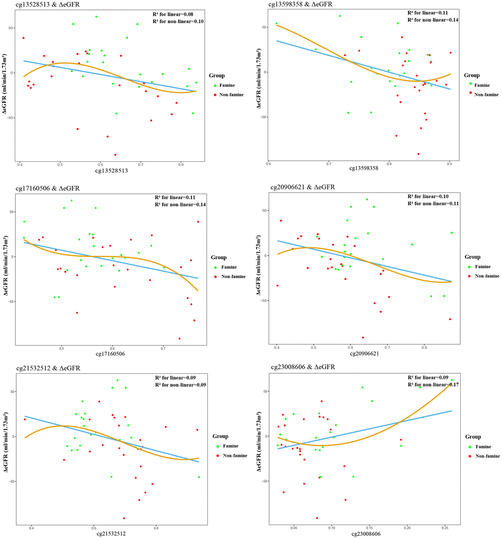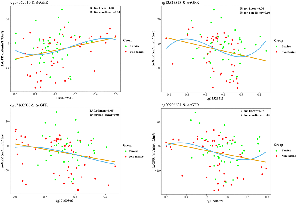 Notable methodological strengths of our study were exhibited as follows. First of all, the present report firstly discussed the mediating effect of methylation alterations on the association between famine and eGFR alteration. Second, this longitudinal cohort was the first large population-based study to investigate the transgenerational effects of parental prenatal famine on eGFR alteration of next-generation in adulthood. Yet this present study also has several certain limitations to be taken into account. First, in contrast to other famines, Chinese famine persisted for a more extended period (about three years) [32] which signified that the famine subjects underwent the intrauterine and infancy stage. But the previous report indicated that the intrauterine stage was regarded as the dominating critical period [33]. Second, Children who were born with deficient birth weight are at risk for the development of chronic kidney disease [34]. And there is a dose-response relationship between worsening in eGFR and birth weight/gestational age [35]. It is deeded a limitation for lacking the data of birthweight and gestational age in the F2 generation. Hence, it is significant to conduct a follow-up study in the future for more comprehensive data. The last limitation is that the CpGs for the mediation-analysis were found only in our Suihua cohort, but some of these differentially methylated sites have been reported in previous famine studies using the Illumina 450k arrays [36–38], such as those located in solute carrier family 38 member 2 (SLC38A2), phospholipid phosphatase 2 (PPAP2C), zinc finger protein 385A (ZNF385A) and family with sequence similarity 150 member B (FAM150B). These consistent observations further demonstrated the impact of famine on the epigenetic changes. Besides, in future research, we would include more cohorts for maximumly eliminating possibilities of overinterpretation and perform animal studies to validate the intergenerational transmission of these DNA methylation sites.