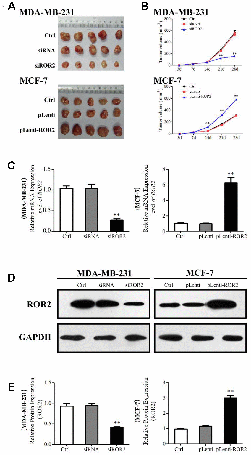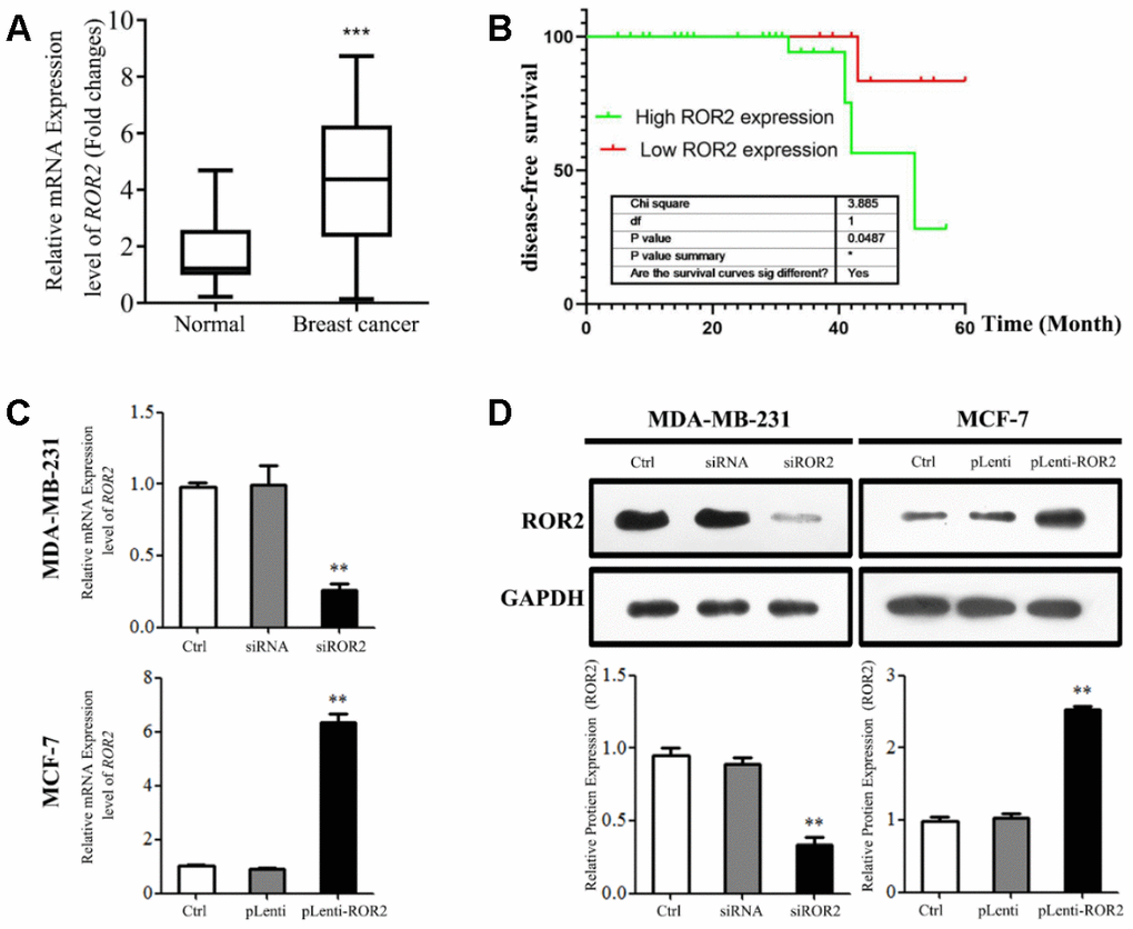 Breast cancer (BC) is one of the most common cancers in women [1]. The receptor tyrosine kinases (RTKs) family plays an important role in physiological processes and development, but also in cancer progression. Receptor tyrosine kinase-like orphan receptor (ROR) forms a small subfamily within the RTK; it has a conserved domain structure consisting of two members, ROR1 and ROR2 [2]. ROR2 is thought to be a crucial regulator in human cancers, serving as a tumor-inducible protein and an oncogene [3]. ROR2 expression is often dysregulated in human cancers, and increased ROR2 levels promote tumor growth, migration, and invasion in multiple cancers including hepatocellular carcinoma [4], non-small cell lung cancer [5], cervical cancer [6], pancreatic cancer [7], melanoma [8, 9], colon cancer [10], head and neck squamous cell carcinoma [11], and breast cancer [12]. A previous Kaplan-Meier survival analysis has indicated that ROR2 is an independent prognostic factor for squamous carcinoma and gallbladder adenocarcinoma, and that low ROR2 levels inhibit squamous carcinoma and gallbladder adenocarcinoma growth [13]. The ROR2 expression is also increased in human non-small cell lung cancer (NSCLC) and correlates with an advanced TNM stage, indicating that ROR2 might be an independent prognostic factor in NSCLC [5]. In multiple myeloma, ROR2 has been shown to exert a pivotal role in cancer cell adhesion; genomic studies have indicated that the pathways mostly deregulated by ROR2 are phosphatidylinositol 3-kinase (PI3K)/AKT and mTOR [14]. However, very little is known about the expression and function of ROR2 in breast cancer.