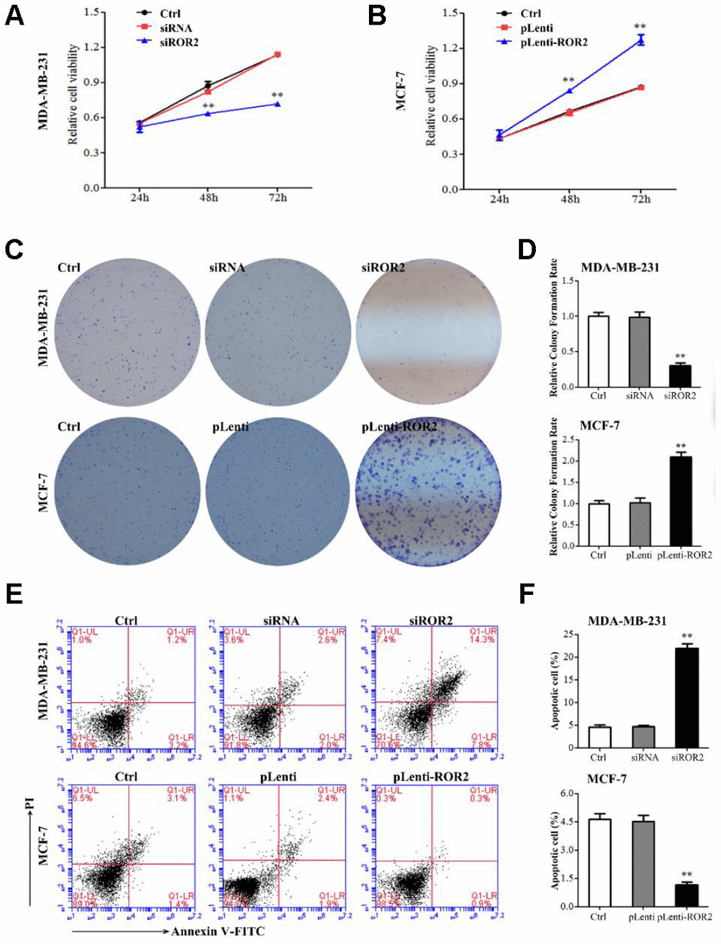 To analyze the ROR2 function in regulating BC cell proliferation, we suppressed the ROR2 expression in MDA-MB-231 cells using siRNA, and overexpressed ROR2 in MCF-7 cells using the ROR2-overexpression plasmid pLenti-ROR2. The endogenous ROR2 expression was effectively suppressed in siROR2 transfected MDA-MB-231 cells compared with cells transfected with control siRNA, while it was increased in pLenti-ROR2 transfected MCF-7 cells compared with control vector pLenti (Figure 1C, 1D). Proliferation of BC cells, analyzed by CCK-8 assay, was significantly inhibited in MDA-MB-231 cells transfected with siROR2, while it was increased in MCF-7 cells transfected with pLenti-ROR2 (Figure 2A, 2B). Furthermore, the colony formation ability of MDA-MB-231 cells was reduced by siROR2, but it was increased in MCF-7 cells by pLenti-ROR2 (Figure 2C, 2D). Flow cytometry analysis showed that ROR2 suppression increased apoptosis of MDA-MB-231 cells, while ROR2 overexpression decreased apoptosis ofMCF-7 cells (Figure 2E, 2F). These results suggest that ROR2 inhibits apoptosis and promotes proliferation of BC cells.