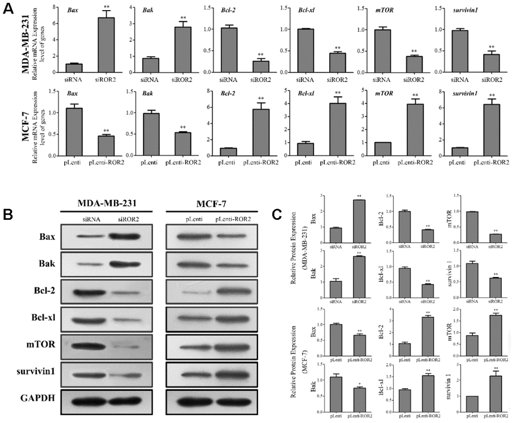 A xenograft model was established in mice implanted with MDA-MB-231 and MCF-7 cells to investigate the role of ROR2 in BC tumorigenesis in vivo. Four weeks after mice injections, the tumor volumes were significantly reduced in the MDA-MB-231-siROR2 group, compared with control or scrambled siRNA groups. In contrast, the tumor volumes were markedly increased in the MCF-7-pLenti-ROR2 group compared with control or pLenti vector groups (Figure 5A, 5B). The ROR2 expression in siROR2-formed tumor tissues was significantly lower than in control or siRNA groups, while the ROR2 expression in pLenti-ROR2-formed tumor tissues was higher than in control or pLenti vector groups (Figure 5C–5E). Moreover, expression of the apoptotic genes Bax, Bak, Bcl-2, Bcl-xl, mTOR, and surviving-1, and the PI3K/AKT signaling genes PI3K, AKT, PDK1,p21, and cyclin D1 followed the same pattern as in the in vitro assays (Figure 6A, 6B). Together, these results indicate that ROR2 promotes BC tumor growth by regulating the expression of apoptotic and PI3K/AKT signaling genes.