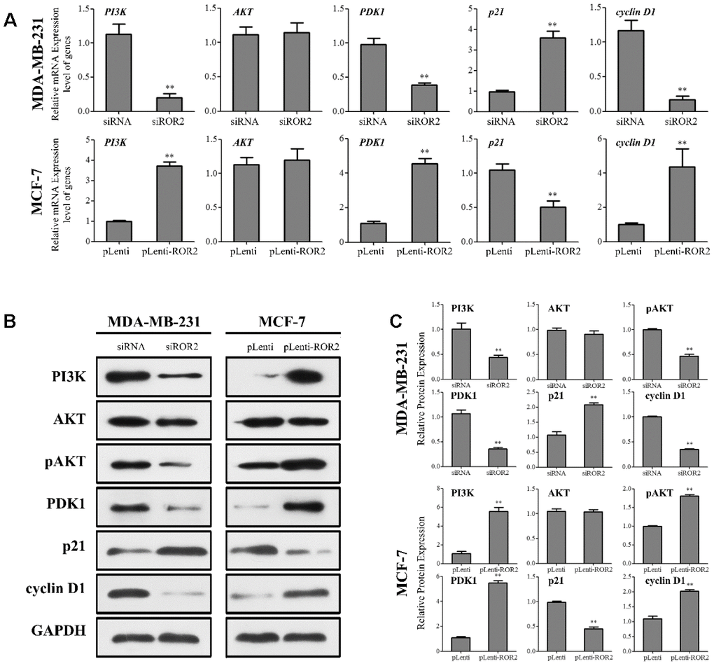 Next, we investigated whether ROR2 regulates the PI3K/AKT signaling pathway in BC cells. ROR2 suppression reduced the protein levels of PI3K and phosphorylated AKT (p-AKT), while ROR2 overexpression increased the protein levels of PI3K and p-AKT (Figure 4A–4C). Furthermore, expression of the downstream genes of the PI3K/AKT pathway, PDK1 and cyclin D1 was reduced, while the expression of p21 was induced in MDA-MB-231 cells after transfection with siROR2. In contrast, the protein levels of PDK1 and cyclin D1 were induced, while p21 was reduced in MCF-7 cells transfected with pLenti-ROR2 (Figure 4A–4C). These results indicate that ROR2 activates the PI3K/AKT signaling in BC cells.