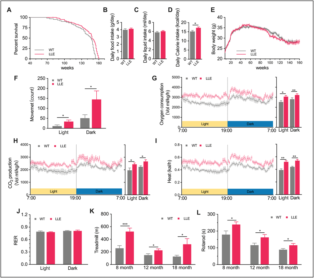 To determine if low-dose ethanol intake influence the dietary habit, the daily food and liquid intake was recorded. There were no noticeable differences between the two groups in the dietary habit (Figure 1B, 1C), but the calorie intake of LLE mice was slightly higher than WT mice (Figure 1D) because the ethanol can be a source of energy. Intriguingly, the higher calorie intake did not lead to weight gain in LLE mice (Figure 1E). However, it led us to wonder if the daily activity of mice was altered. Comprehensive Lab Animal Monitoring System was subsequently used to monitor mice activity and metabolic rates. With the supplement of ethanol, the LLE mice tend to be more active (Figure 1F). The higher oxygen consumption (Figure 1G), carbon dioxide production (Figure 1H) and heat production (Figure 1I) in both light phase and dark phase indicated that the basal metabolic rates of the LLE mice increased. Also noteworthily, the respiratory exchange ratio (RER) of two groups are almost the same (Figure 1J), suggesting comparable rates of oxidation of fat and carbohydrates in this state.