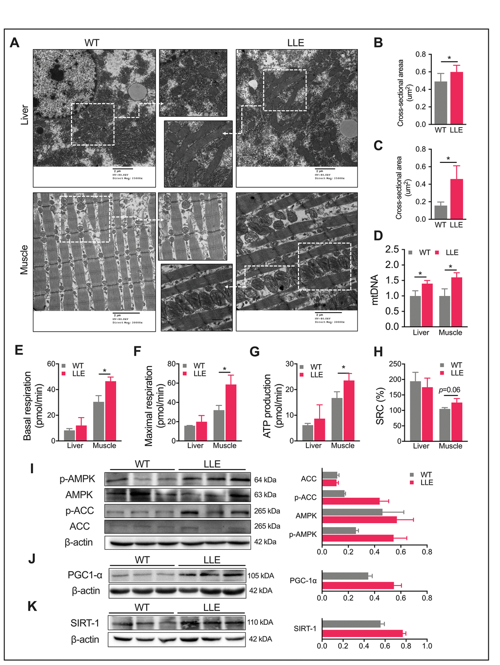 Increased daily activity and improved physical performance of the LLE mice implied enhanced mitochondrial function. We next examined the mitochondria in liver and muscle using electron microscopy. A markedly increased number of mitochondria in the liver and gastrocnemius muscle of LLE mice was observed in the images, displaying visibly larger mitochondrial structures with an increased presence of cristae in the LLE mice (Figure 2A–2C). Mitochondrial DNA (mtDNA) content was also quantified by PCR. As expected, mtDNA markedly increased in the LLE mice (Figure 2D). To further evaluate the mitochondrial function of the LLE mice, the oxygen consumption rate (OCR) of the liver and the muscles were examined. The basal oxygen consumption rate was elevated in the muscles of the LLE mice (Figure 2E). Following the addition of oligomycin and FCCP, the muscles of LLE mice showed an increased ATP production and maximal respiration (Figure 2F, 2G). Spare respiratory capacity (SRC), the extra mitochondrial capacity available in cell to produce energy under conditions of increased work or stress, was also slightly increased (P=0.06, Figure 2H). Taken together, these results indicate that mitochondrial function was enhanced under the long-term ethanol treatment in the LLE mice.